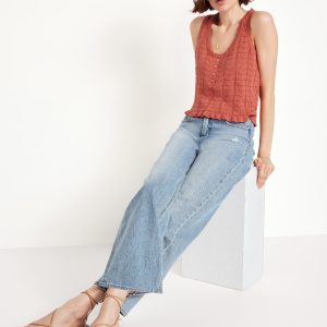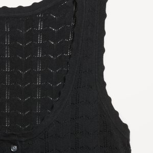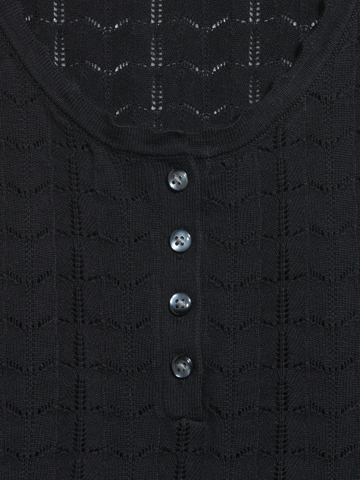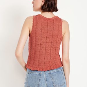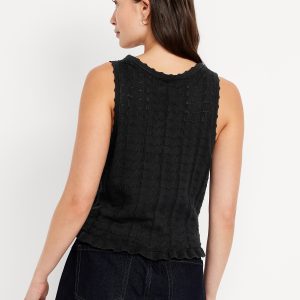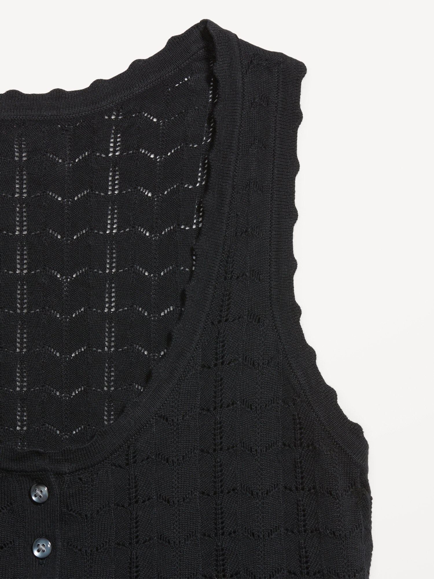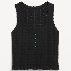 Sleeveless Pointelle Cropped Henley Top: scoop neck, wide straps, button-henley placket, ruffled hem, #785032