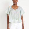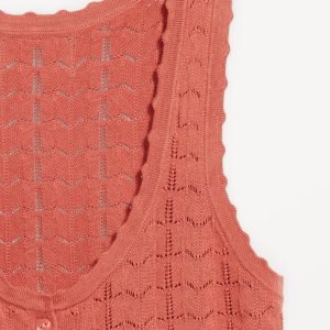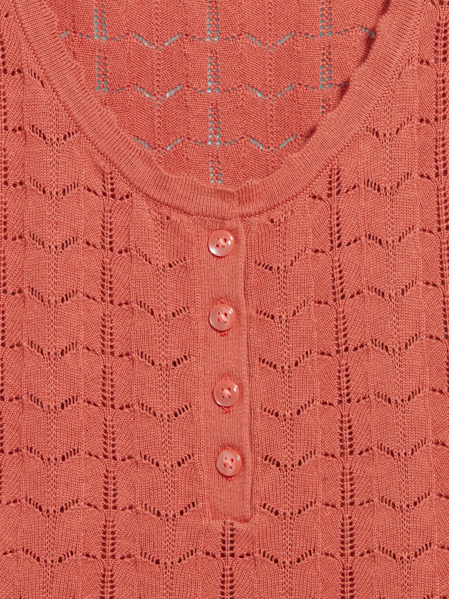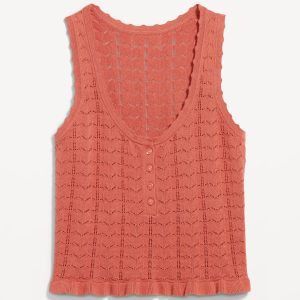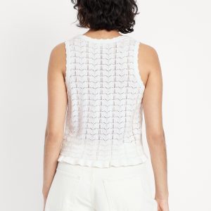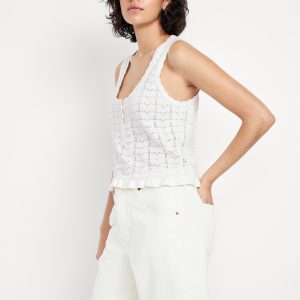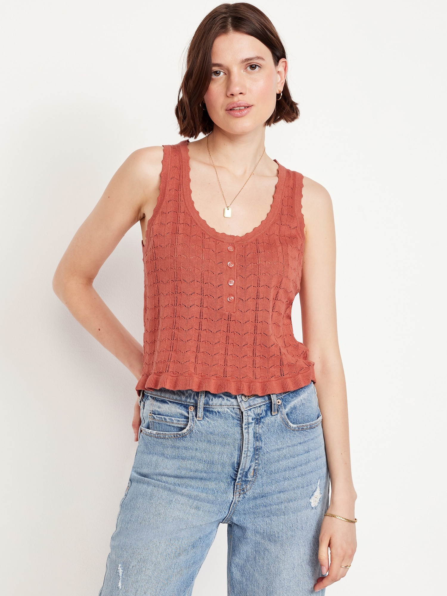 Sleeveless Pointelle Cropped Henley Top: scoop neck, wide straps, button-henley placket, ruffled hem, #785032