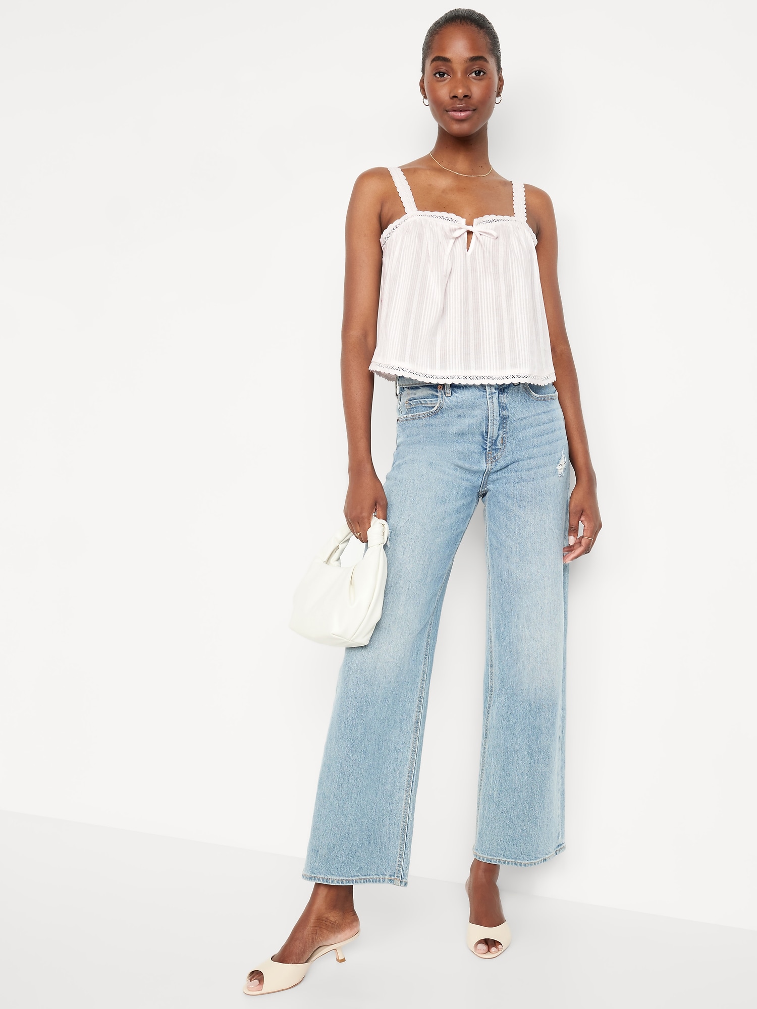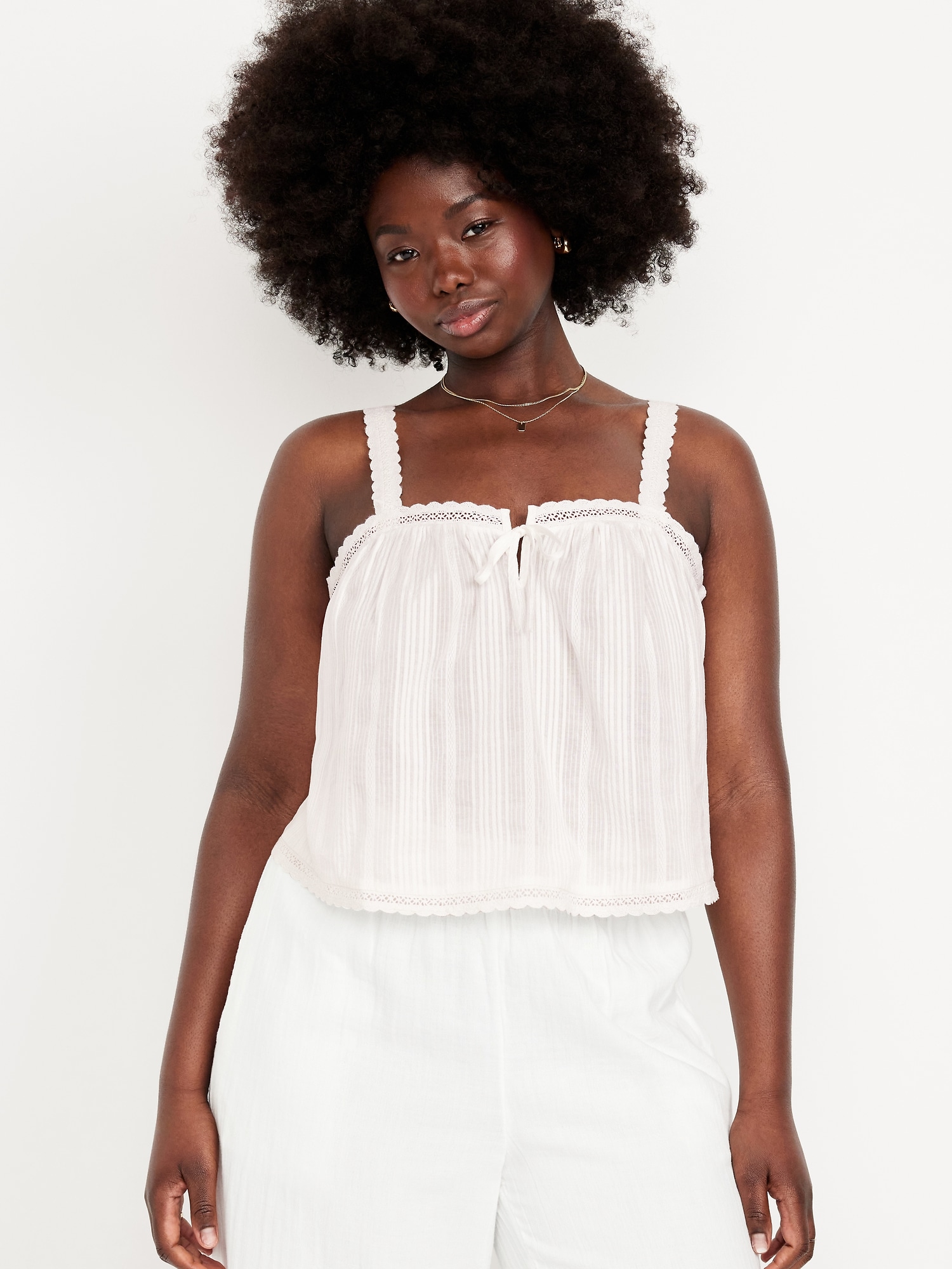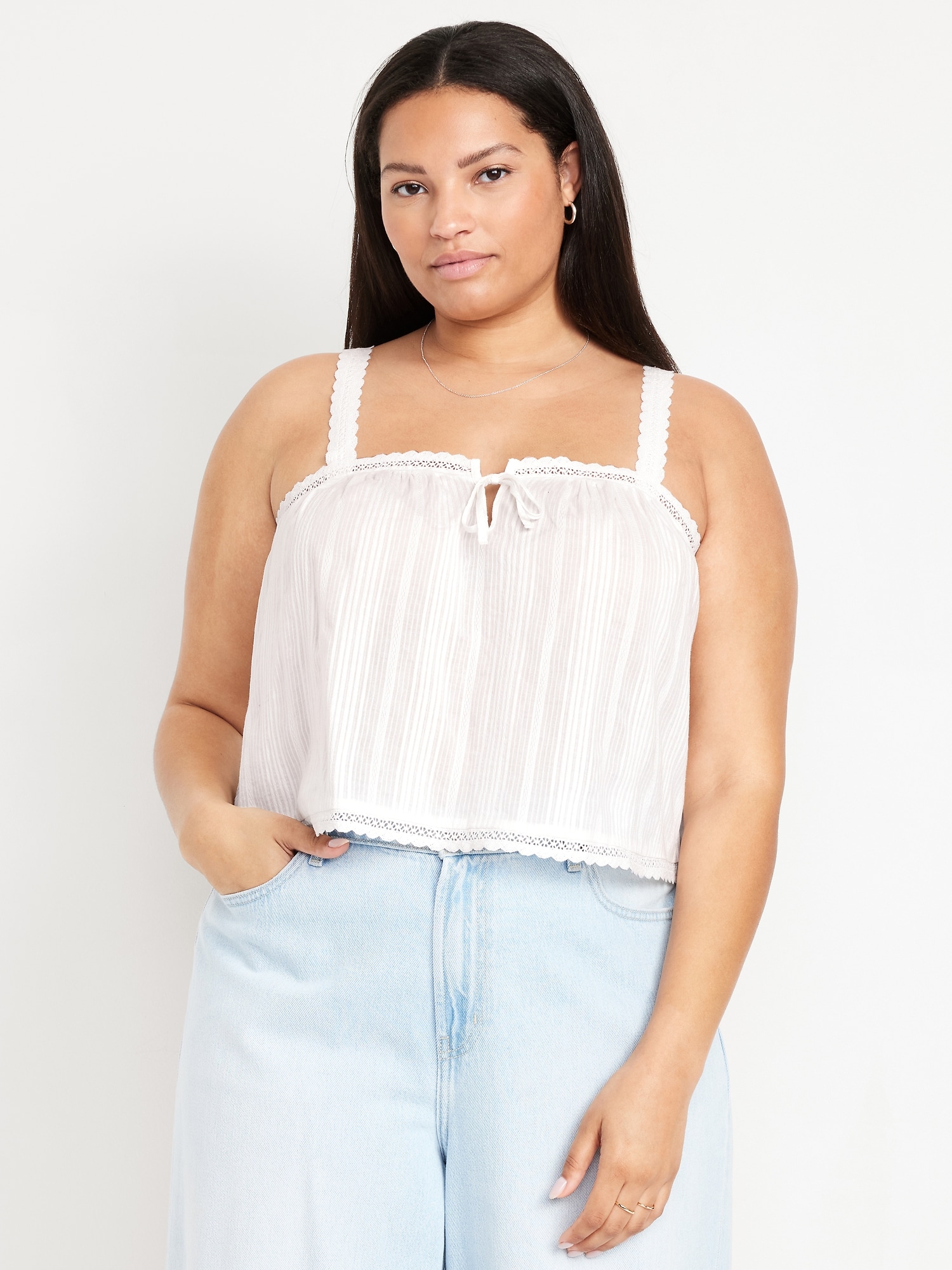 Sleeveless Textured-Dobby Top: wide straps, notched tie-front accent, crochet-lace trim, shirred detail, #764188