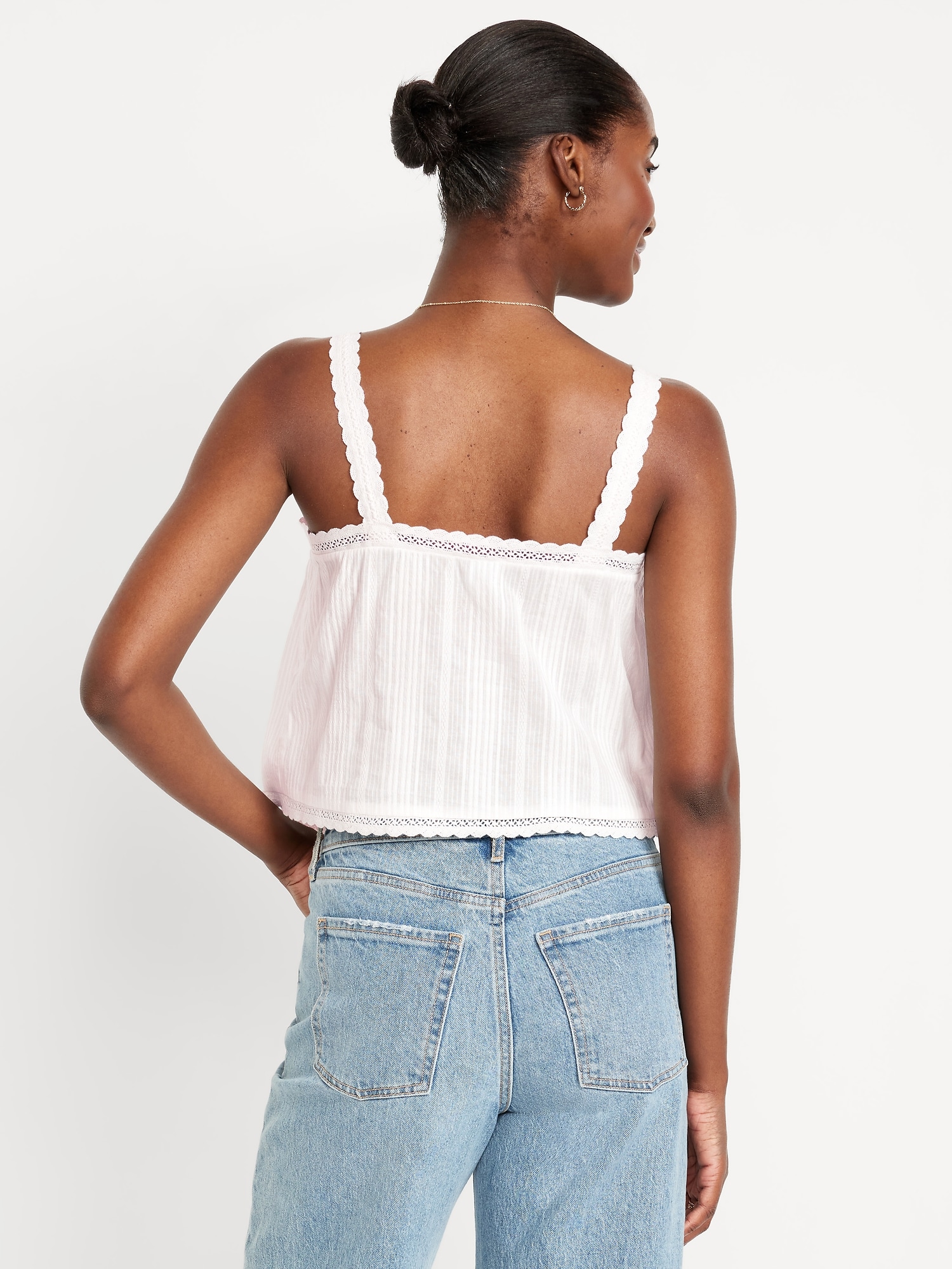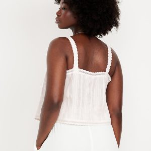 Sleeveless Textured-Dobby Top: wide straps, notched tie-front accent, crochet-lace trim, shirred detail, #764188