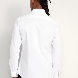 Slim Fit Pro Signature Performance Dress Shirt: 2″ pointed collar, built-in collar stays, long sleeves, buttoned cuffs, full-button front, breathable, quick drying, go-dry wicks moisture, #418101