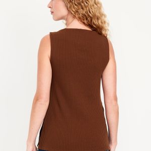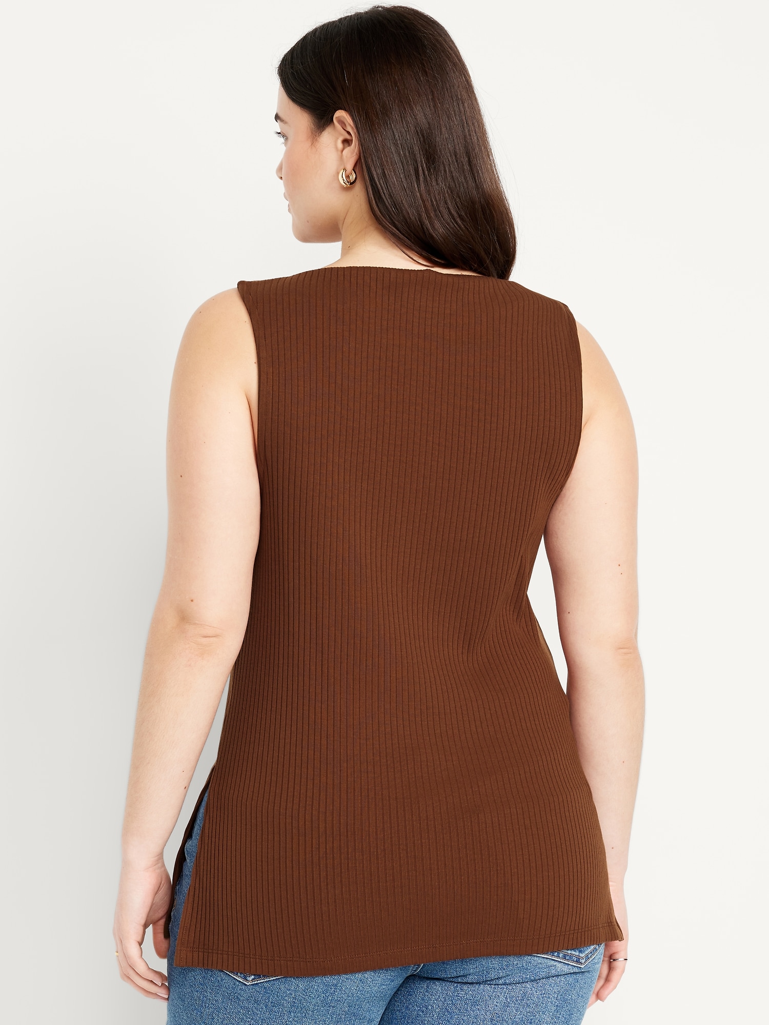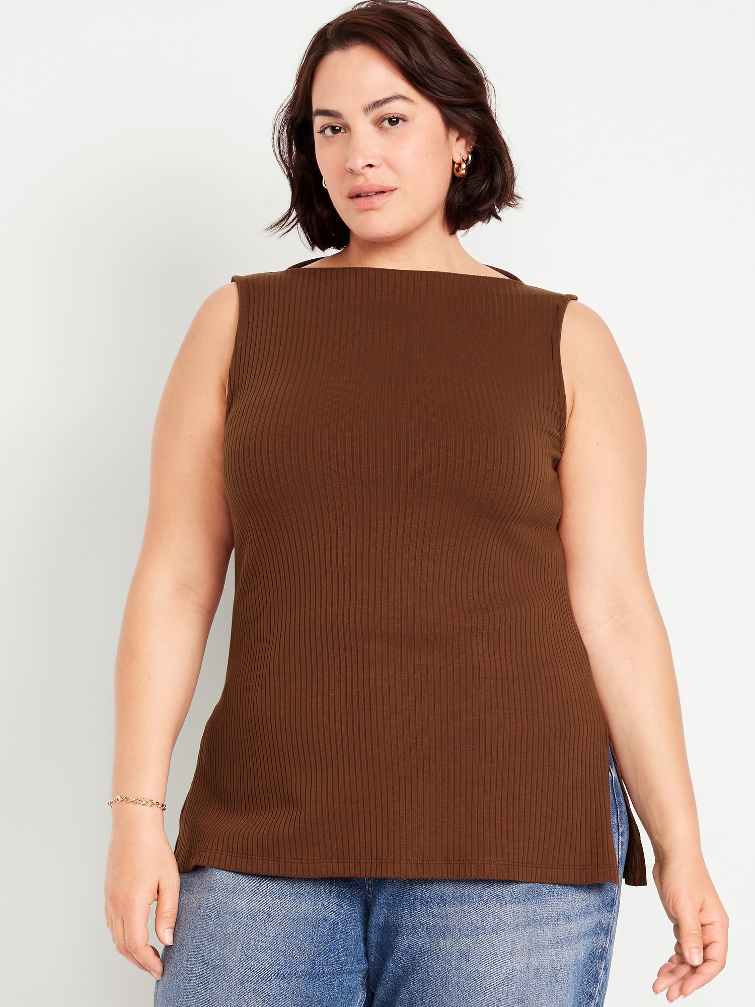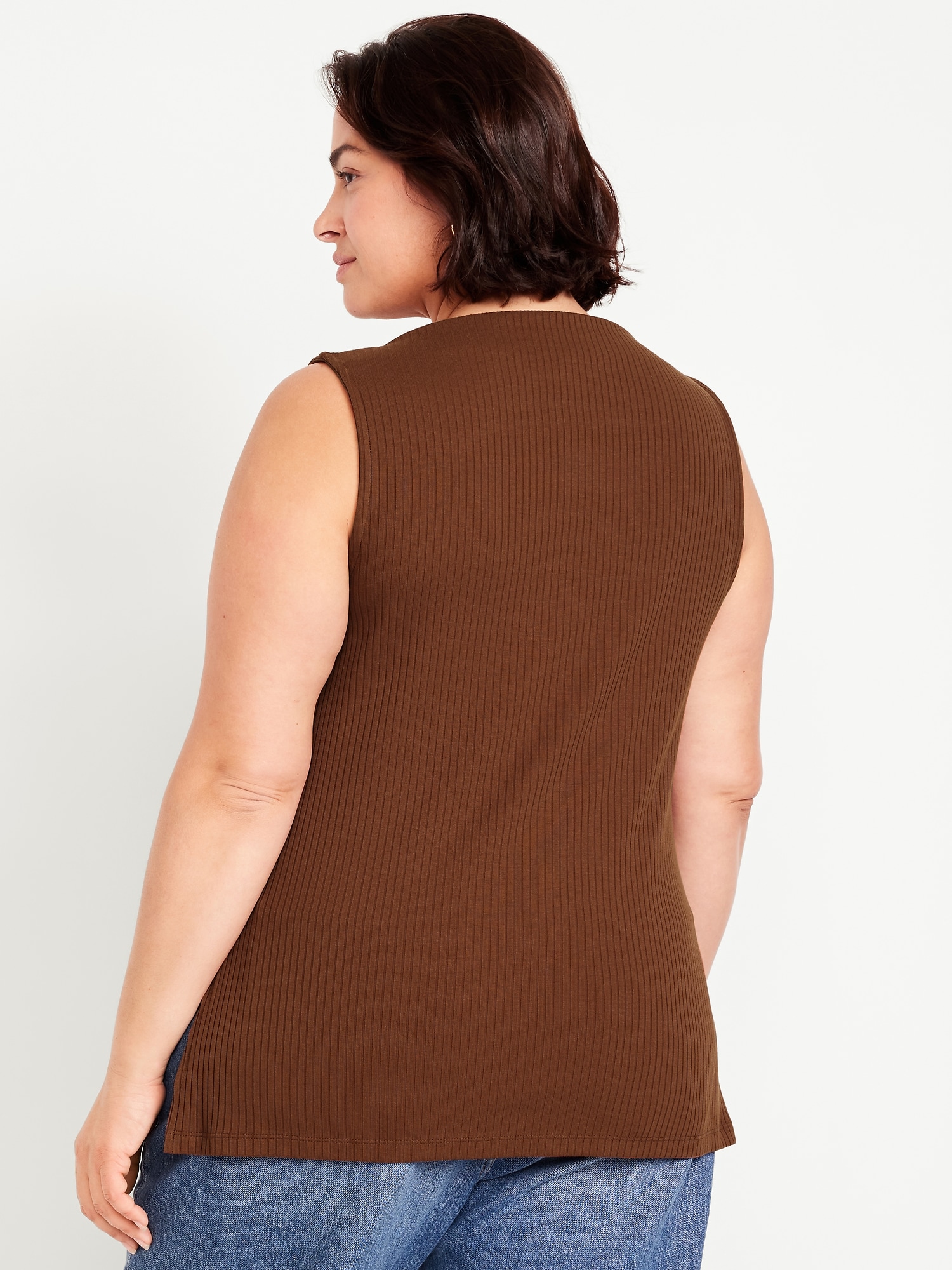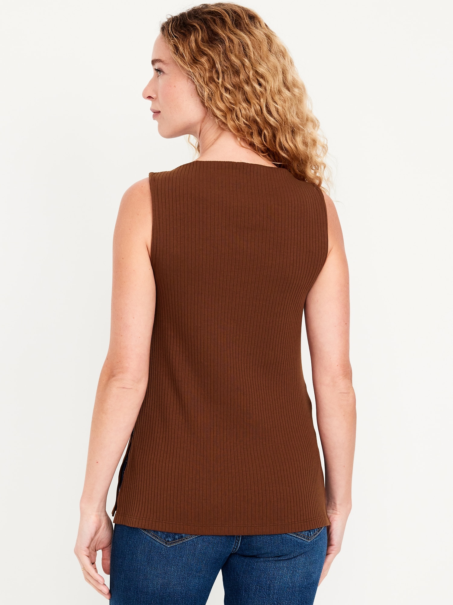 Slit-Neck Ribbed Top: high neck, sleeveless, side slits, #738891