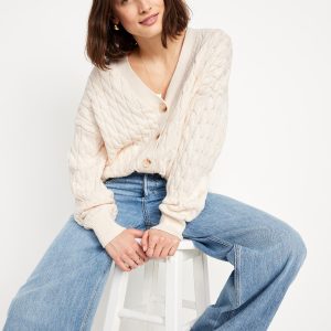 Slouchy Cable-Knit Cardigan Sweater: deep v-neck, long sleeves, button front, contrasting tipped trim, #784426