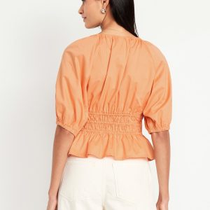 Smocked V-Neck Peplum Top: deep v-neck, elbow sleeves, elastic cuffs, smocked waist, peplum hem, gingham print, #704199