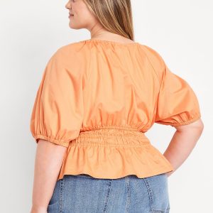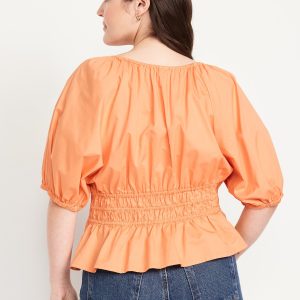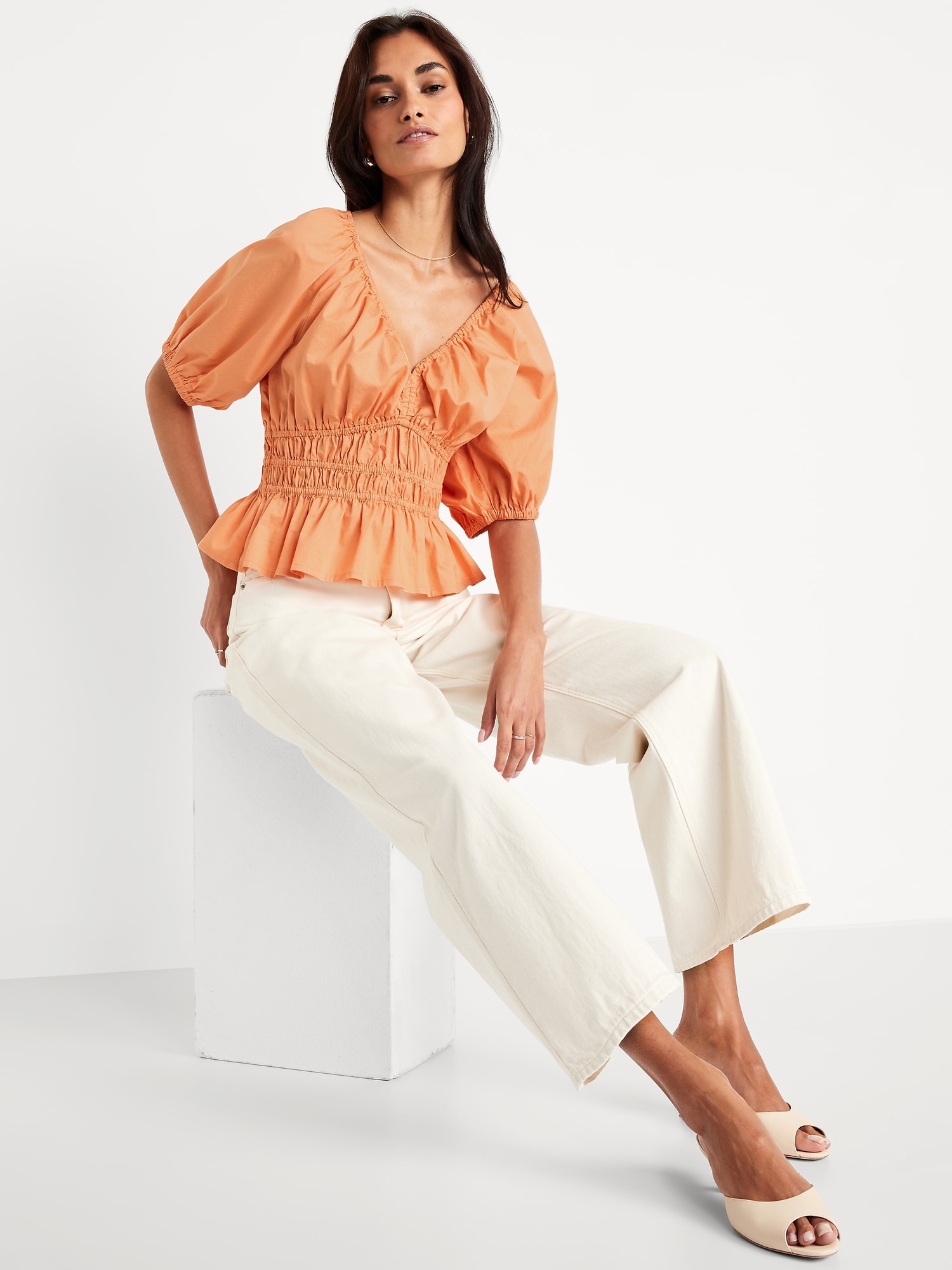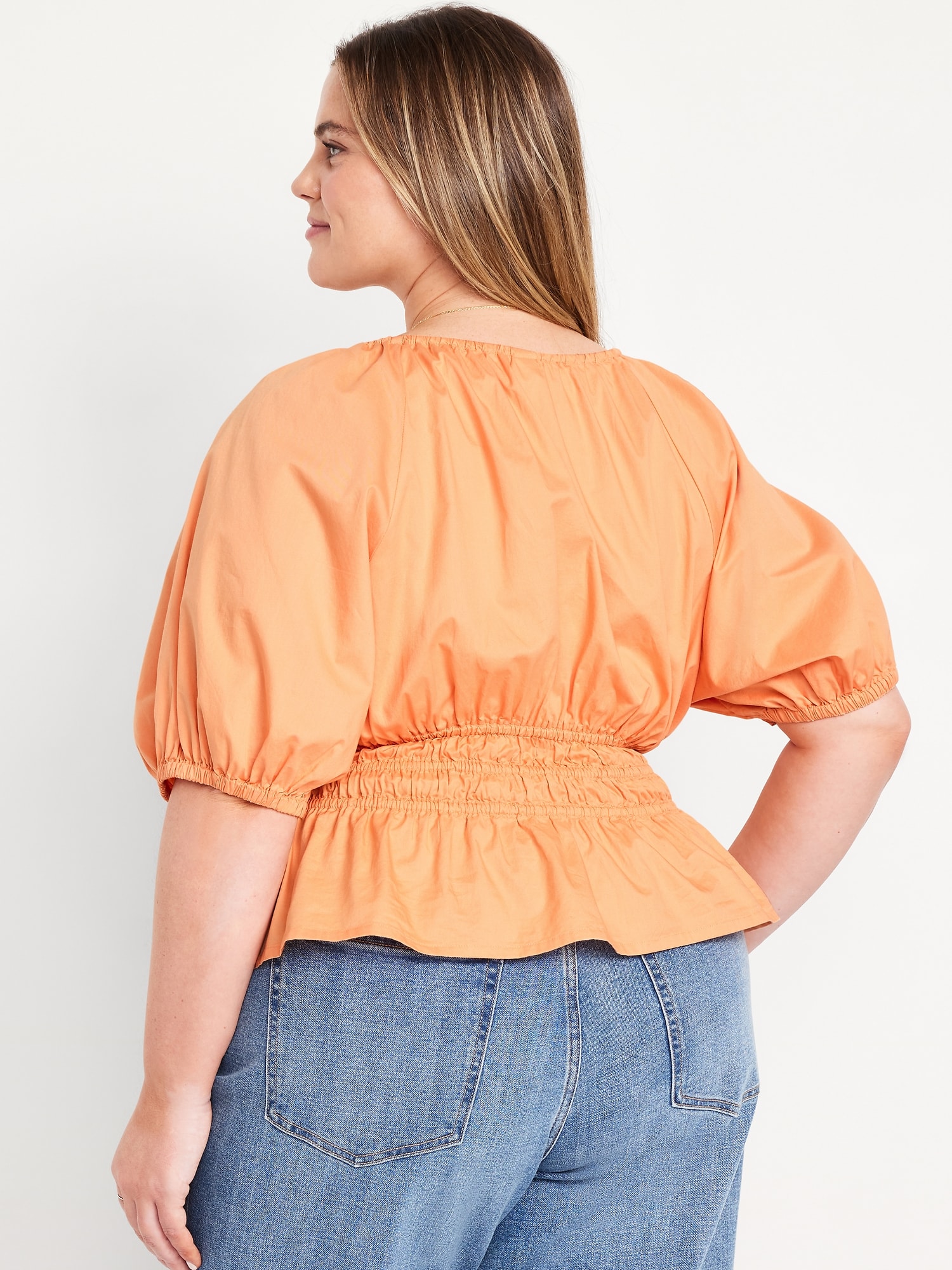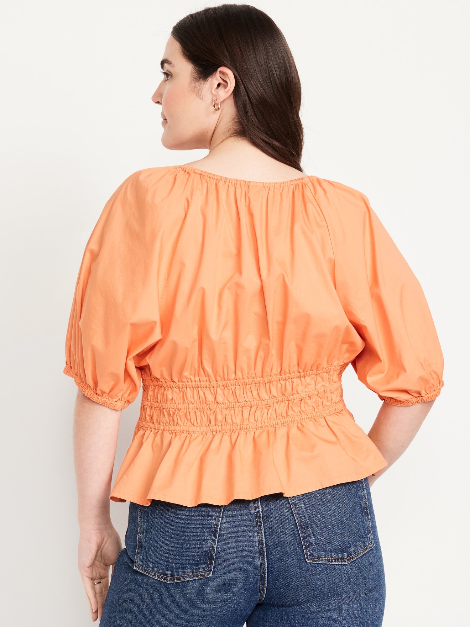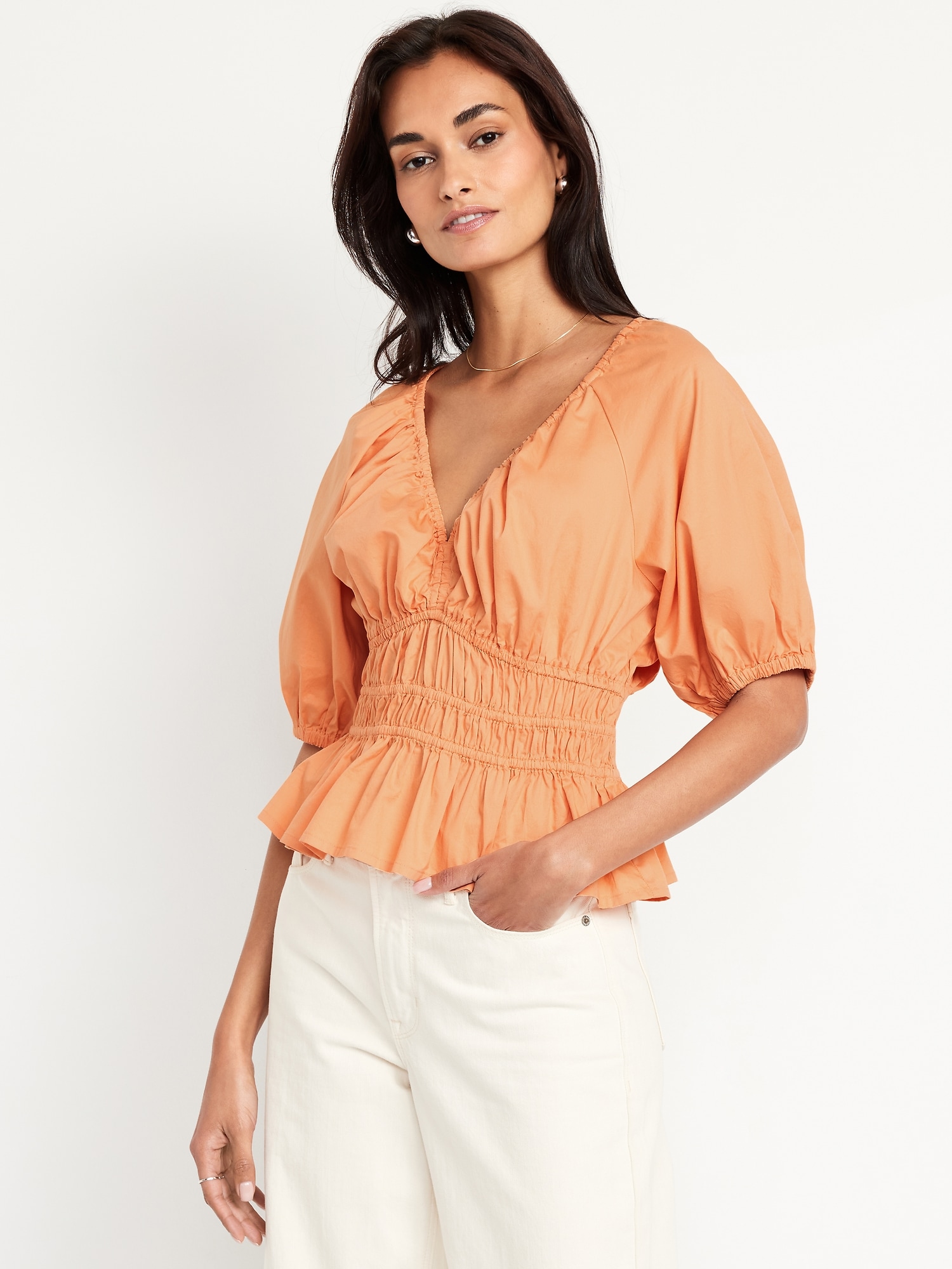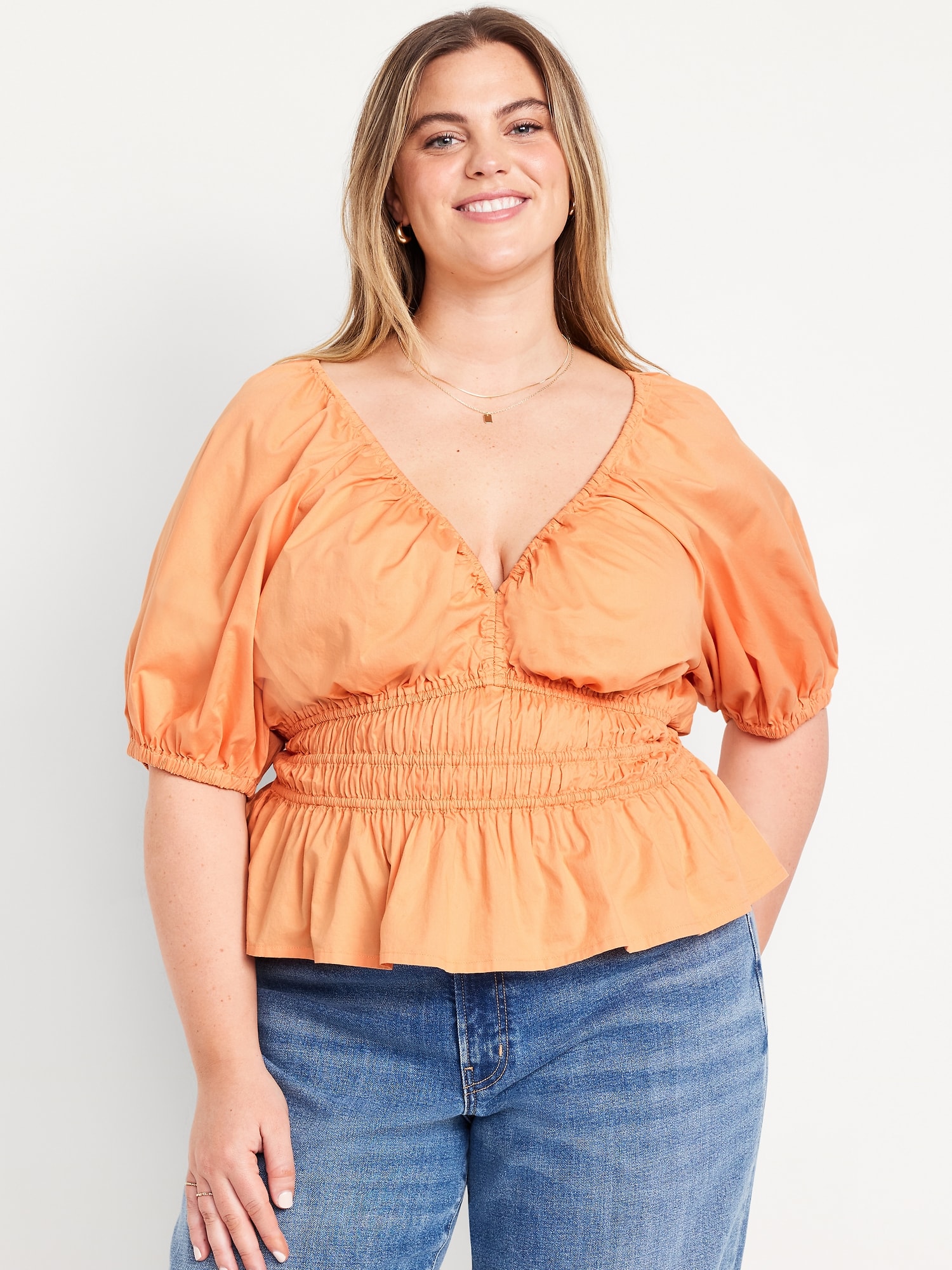 Smocked V-Neck Peplum Top: deep v-neck, elbow sleeves, elastic cuffs, smocked waist, peplum hem, gingham print, #704199