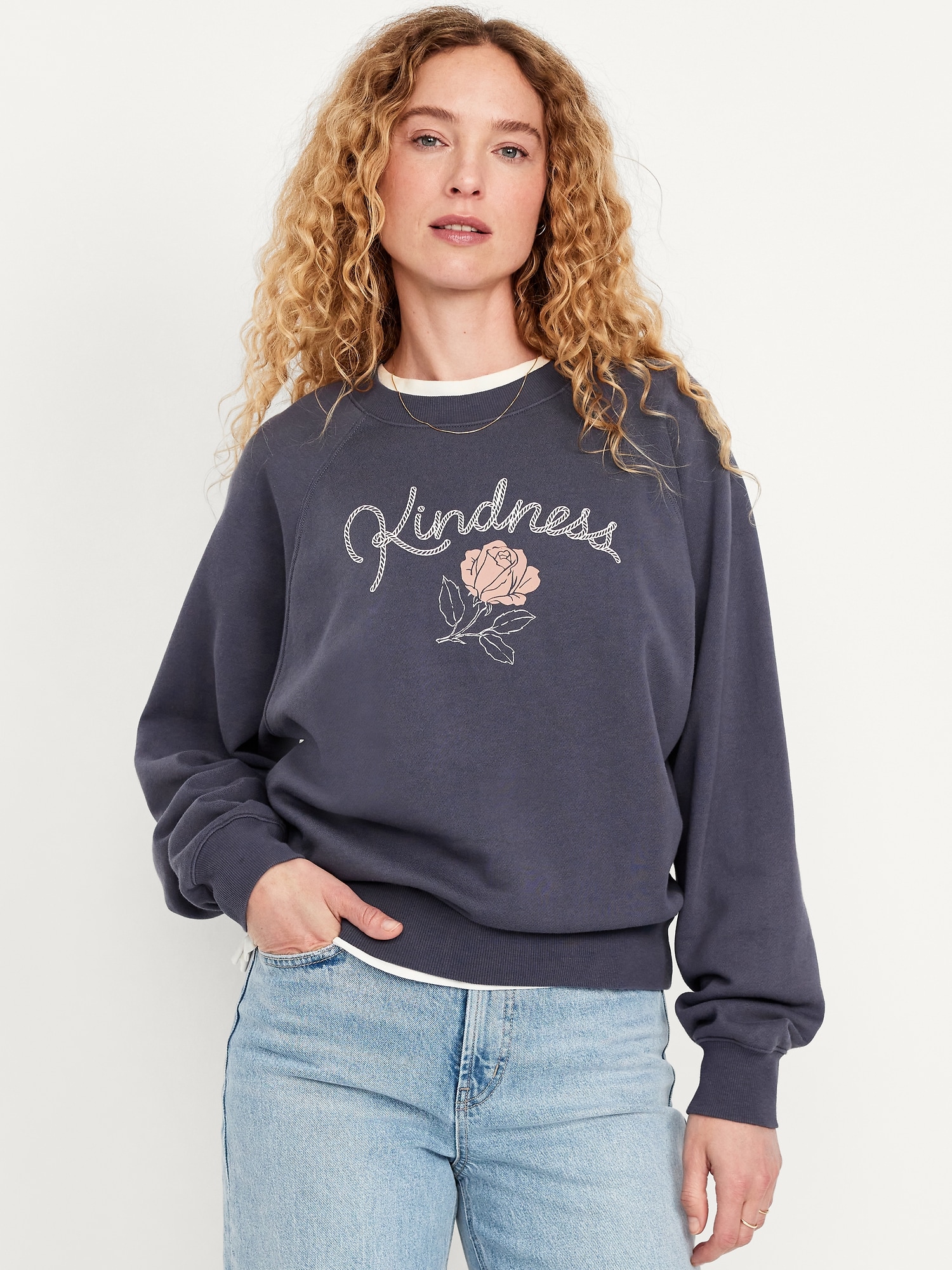 SoComfy Oversized Graphic Raglan Sweatshirt: The perfect-weight, never-taking-this-off fleece.embroidered floral accent, crew neck, long raglan sleeves, rib-knit trim, pullover style, #824100