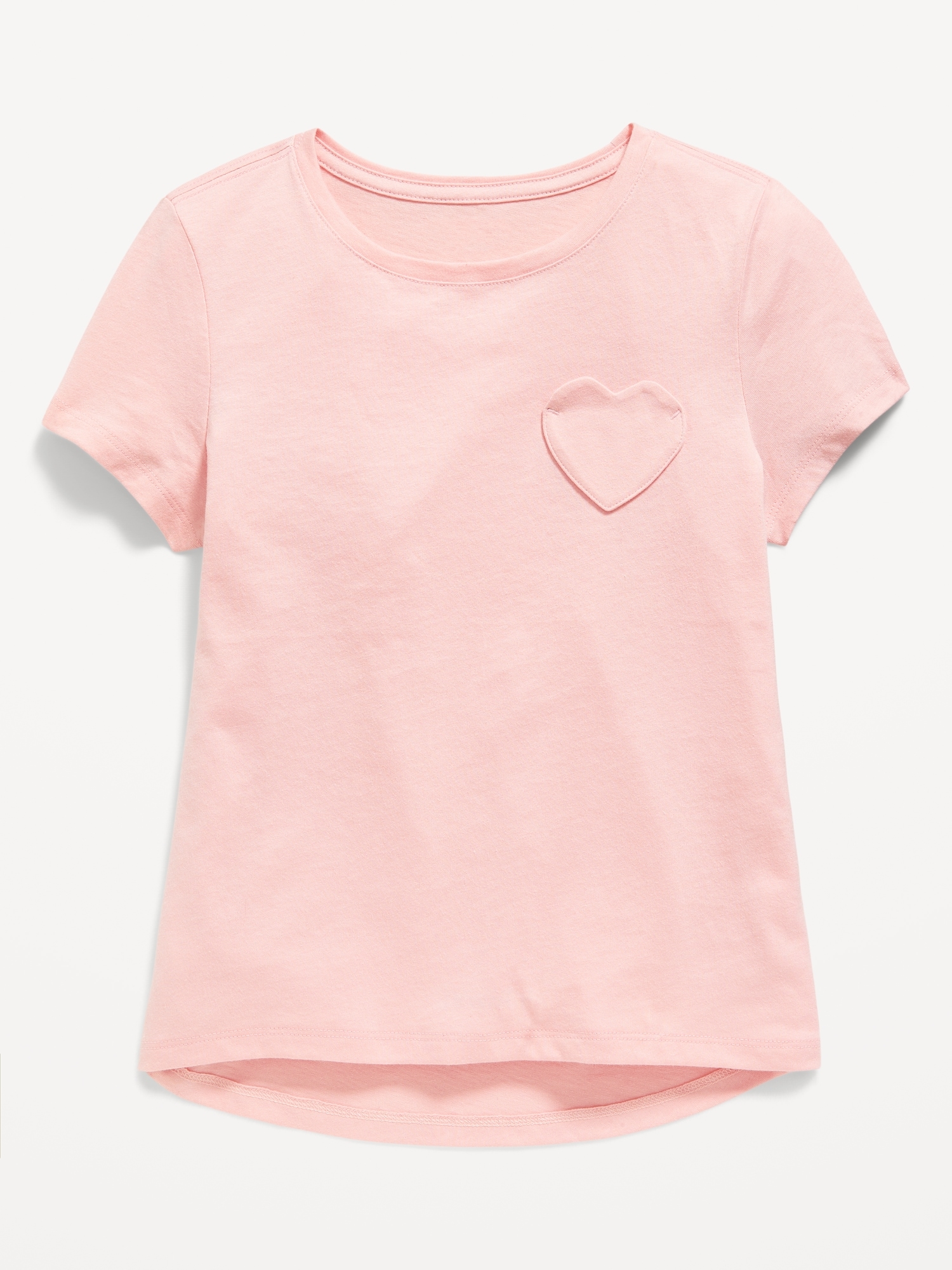 Softest Heart-Pocket T-Shirt for Girls: scoop neck, short sleeves, heart shaped patch pocket, hi-lo hem, #867799