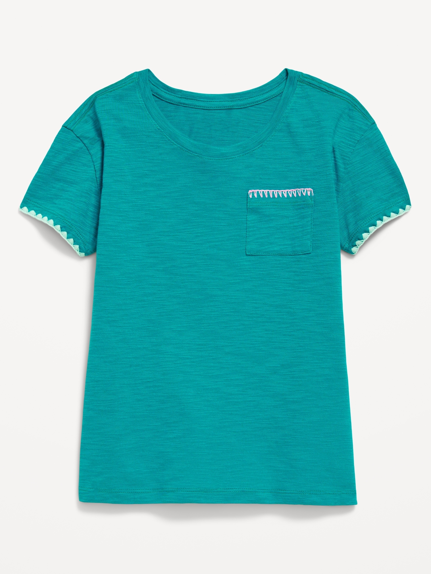 Softest Stitch-Trim Pocket T-Shirt for Girls: scoop neck, short sleeves, patch pocket at chest, contrasting stitching along pocket and sleeve cuffs, #766953