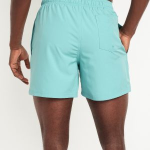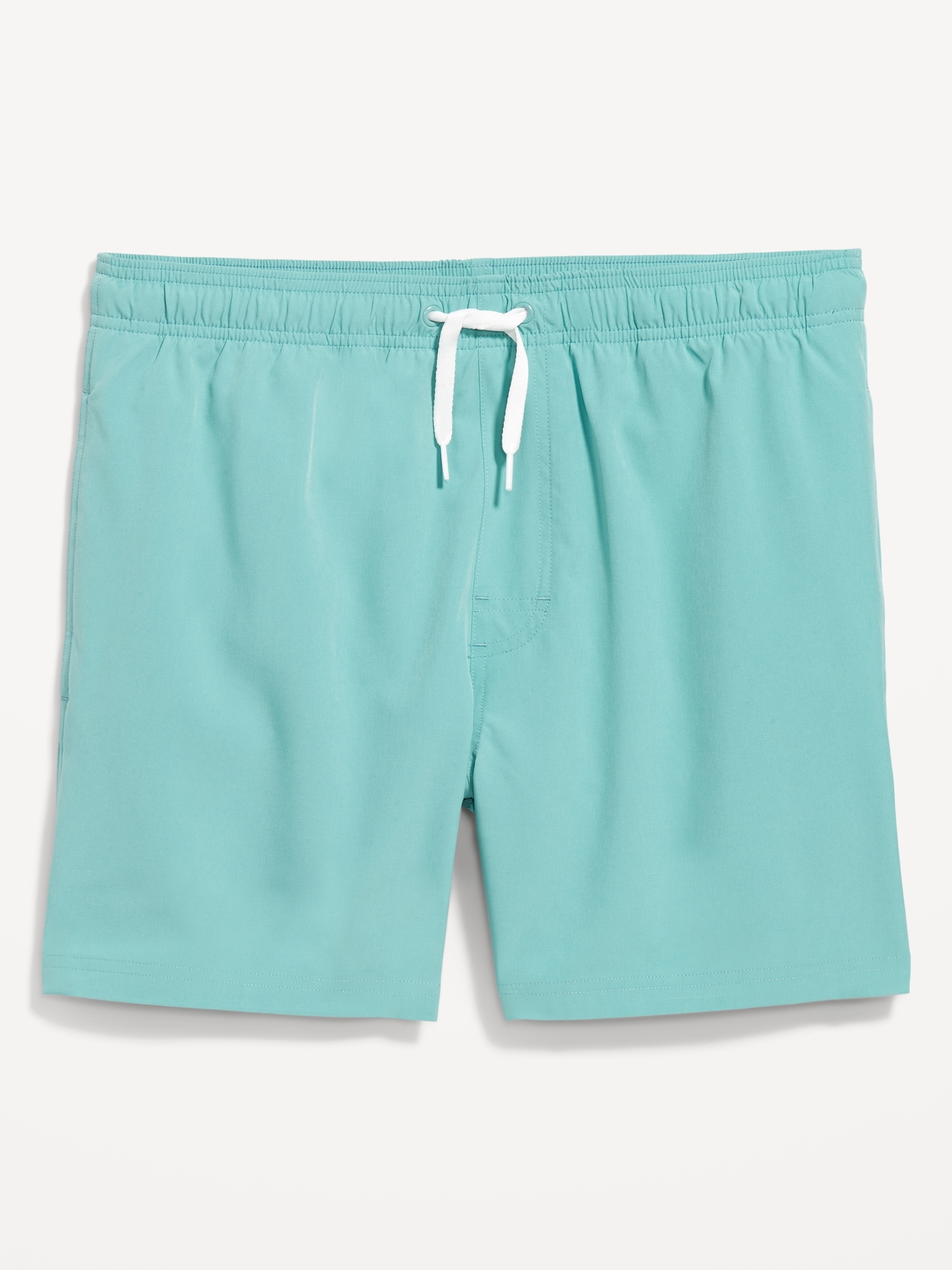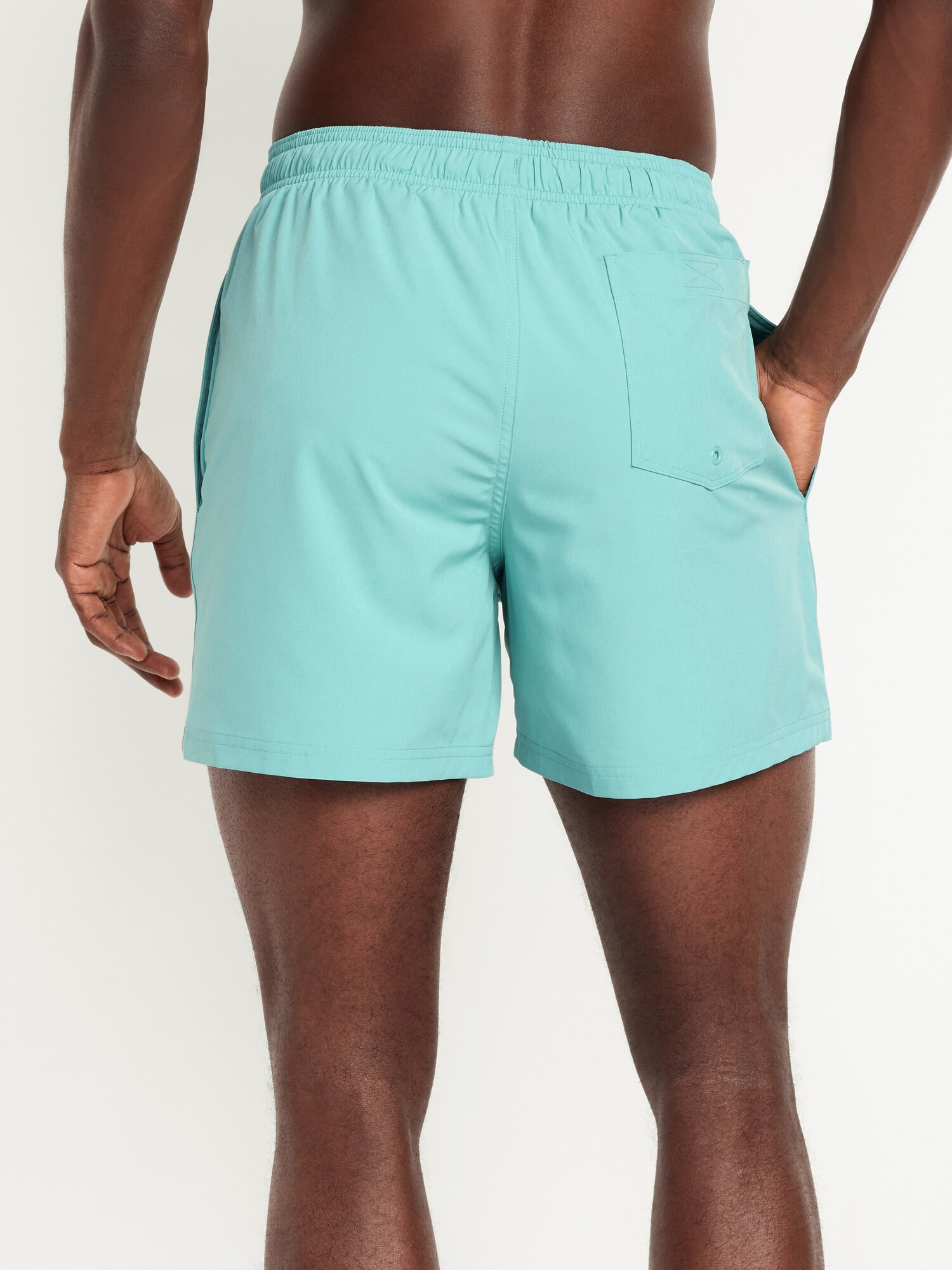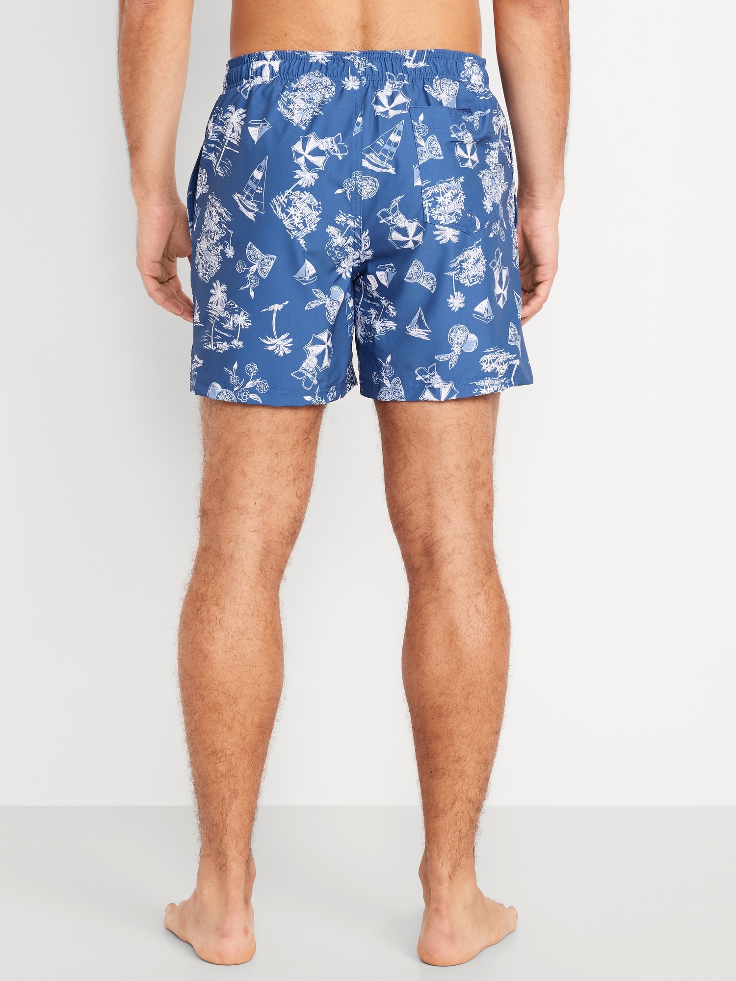 Solid Swim Trunks — 5-inch inseam: elastic-drawstring waistband, on-seam pockets, back pocket with grommet drain, built-in mesh briefs, pull-on style, all-over cocktail print, #766289