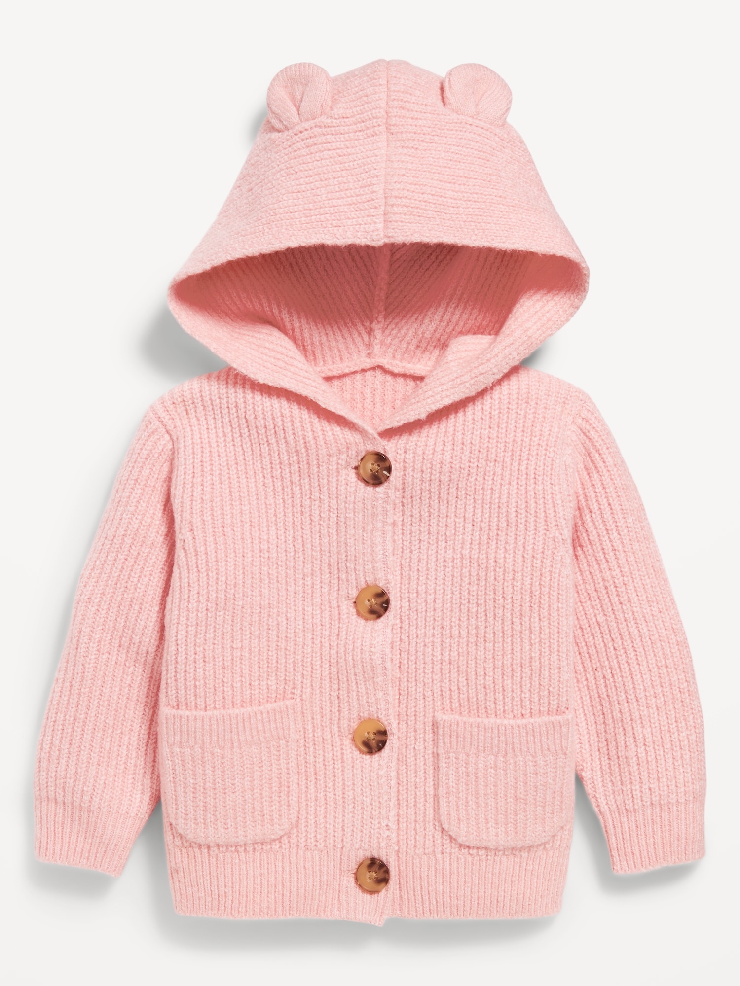 SoSoft Critter Ear Button-Front Sweater for Baby: We call it SoSoft, because it’s whipped-soft, not too heavy, not too thin. The goldilocks of sweaters.built-in hood with critter bear “ears”, long sleeves, patch pockets at hem, full button front, #494402