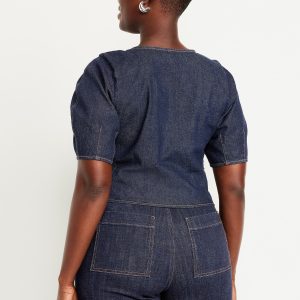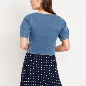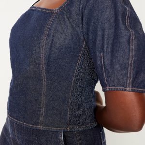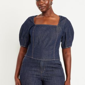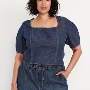 Square-Neck Denim Crop Top: square neck, short puff sleeves, smocked side panels, seamed front, #805746