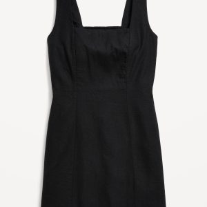 Square-Neck Linen-Blend Mini Dress: square neck, wide straps, smocked back, princess seams, mini length, gingham print, #708450