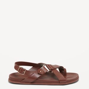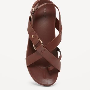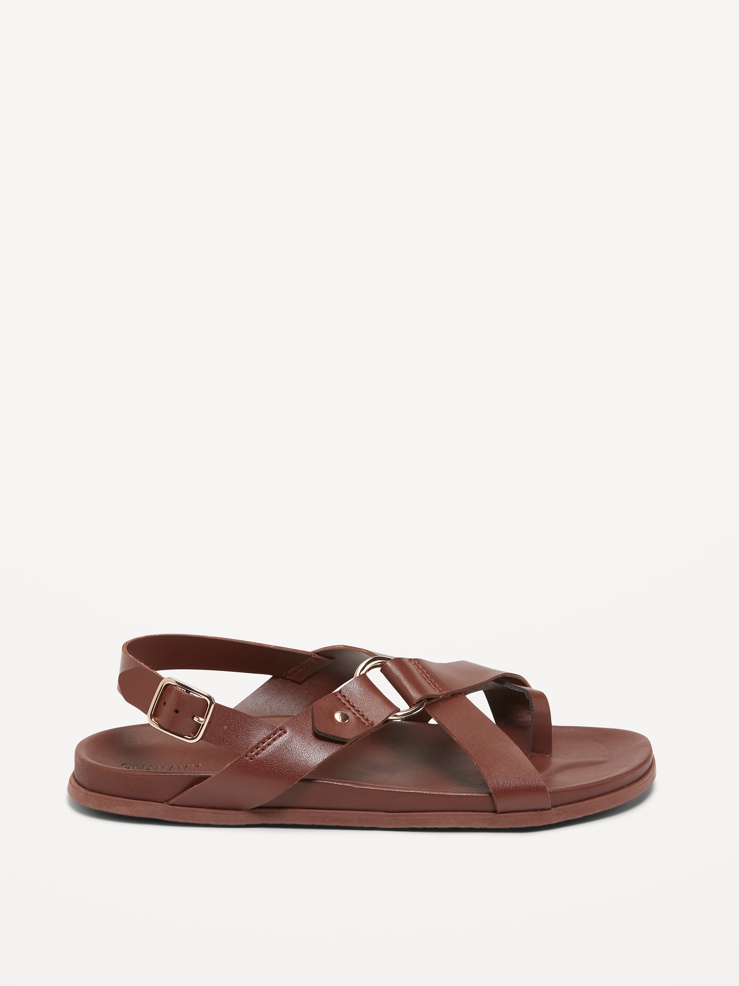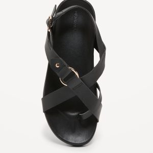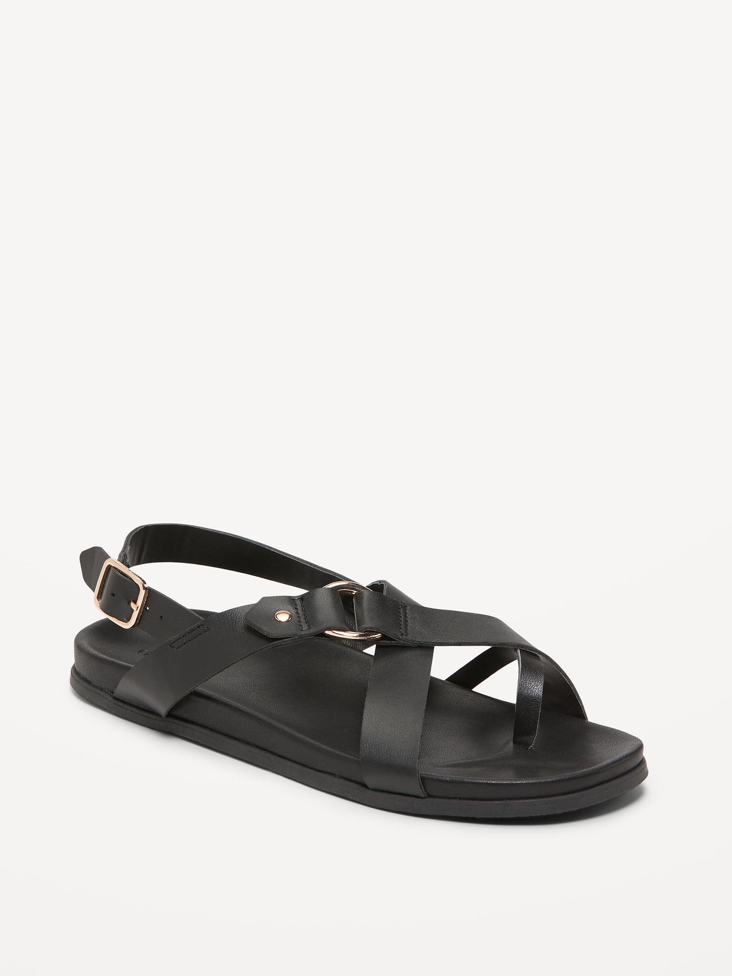 Strappy O-Ring Sandals: faux leather upper, buckle fastening, gold tone O-ring detail, molded foot bed, #663906