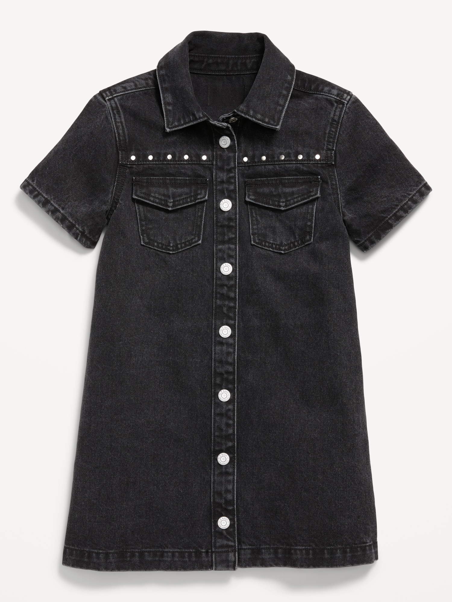 Studded Pocket Jean Shirt Dress for Girls: pointed collar, short sleeves, flap pockets at chest, studs at chest, full-length snap-button placket in sizes xs-m, full length regular button placket in sizes l-xxl, #802952