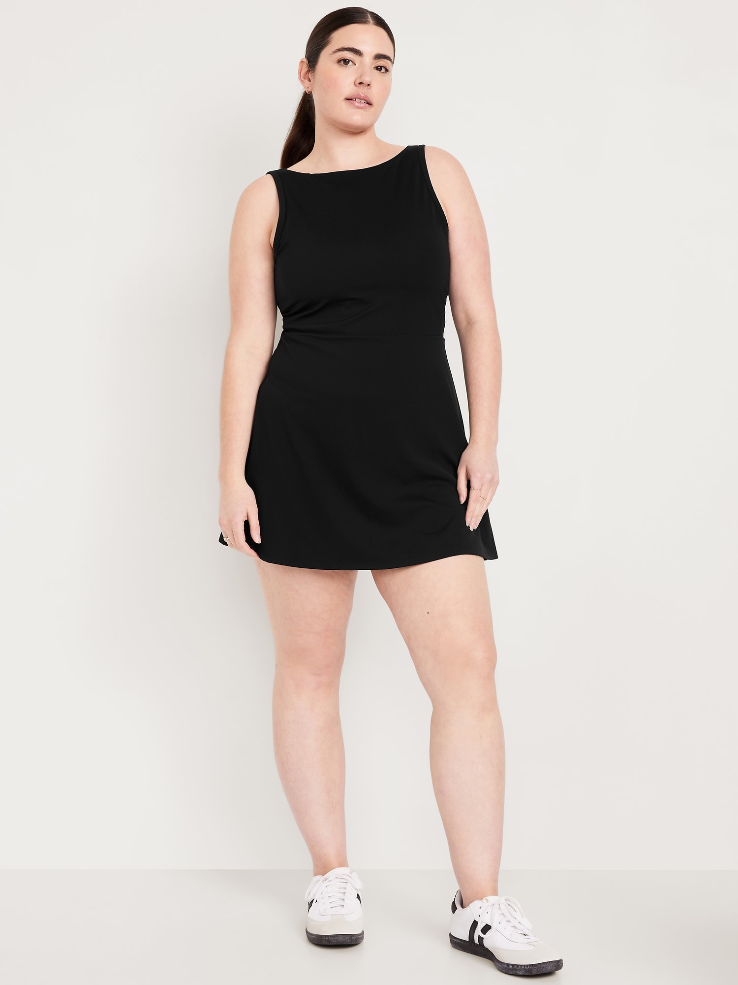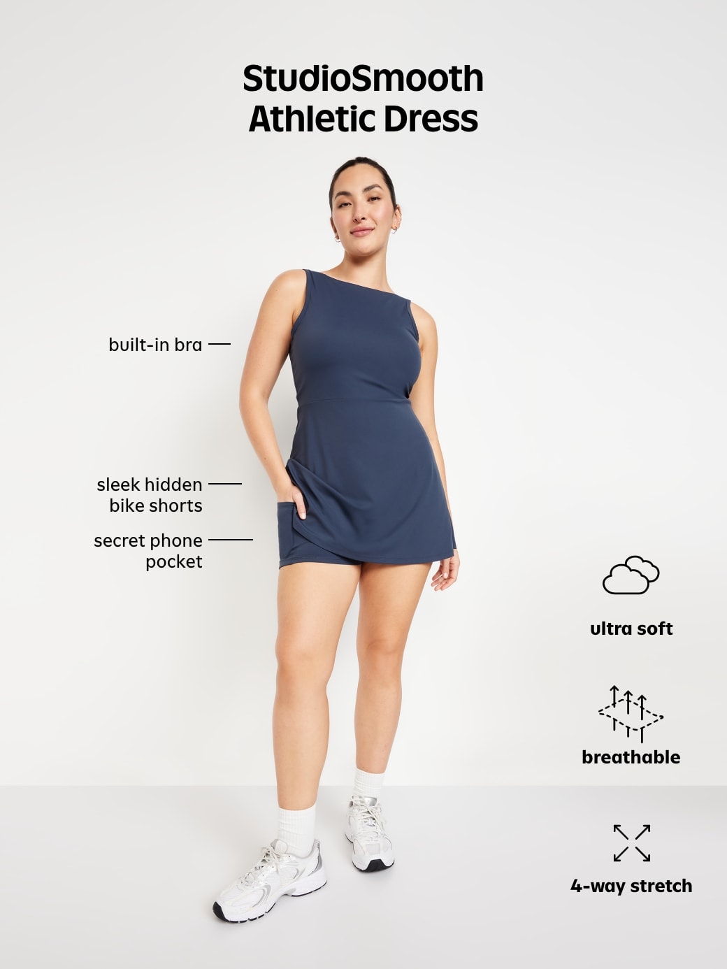 StudioSmooth Athletic Dress: Featuring StudioSmooth. Buttery soft and breathable, with a barely-there feel.built-in shelf bra and biker shorts, wide straps, low scoop back, lined shelf bra, removable pads, go-dry wicks moisture, #763222