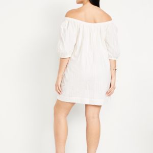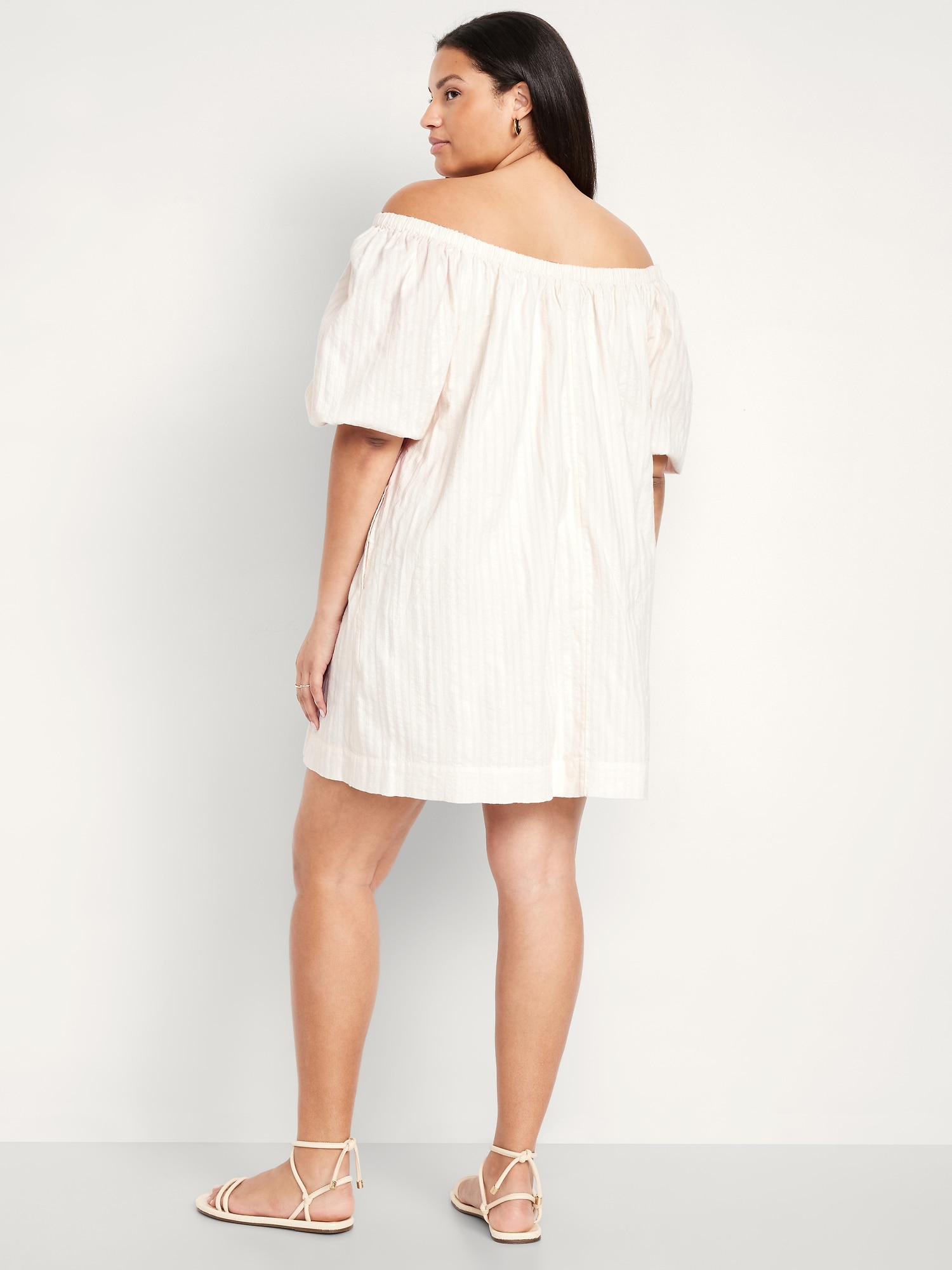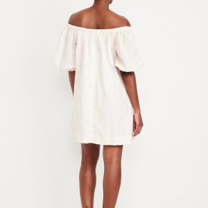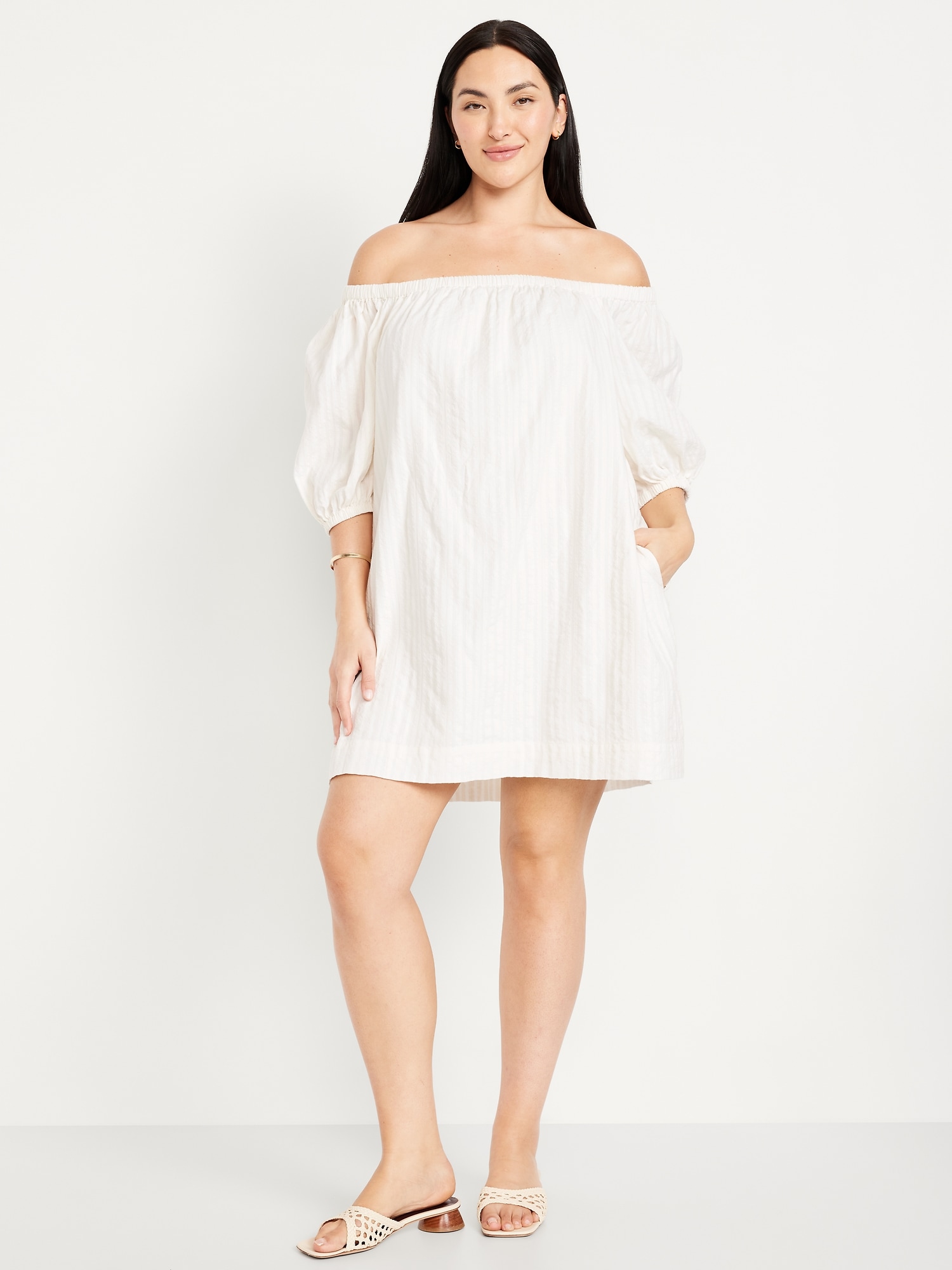Textured-Dobby Mini Swing Dress: elastic neckline can be worn on or off shoulder, elbow-length puff sleeves, on-seam pockets, mini length, striped print, #766924