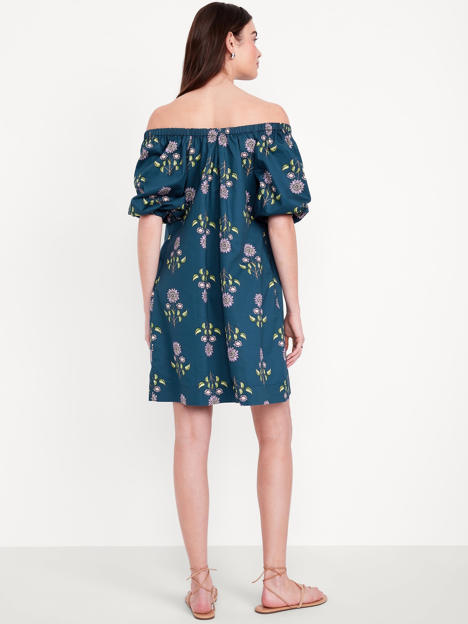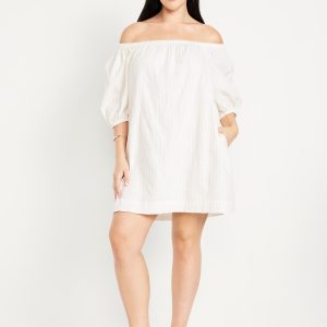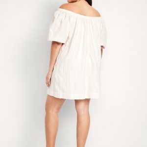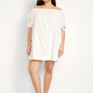 Textured-Dobby Mini Swing Dress: elastic neckline can be worn on or off shoulder, elbow-length puff sleeves, on-seam pockets, mini length, striped print, #766924