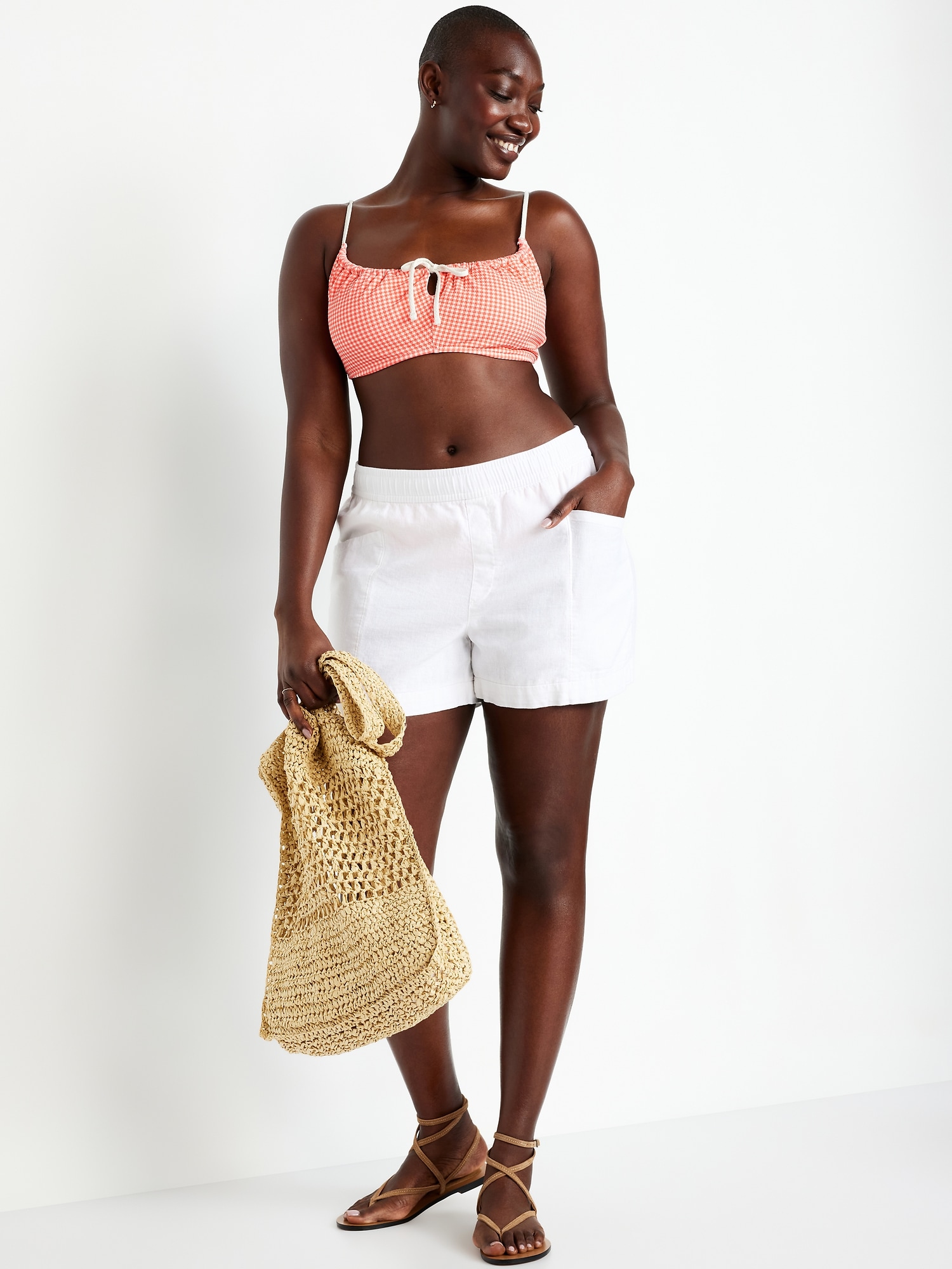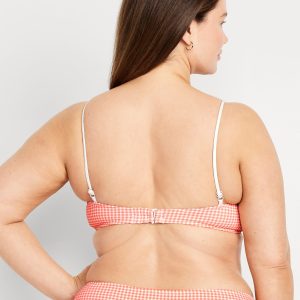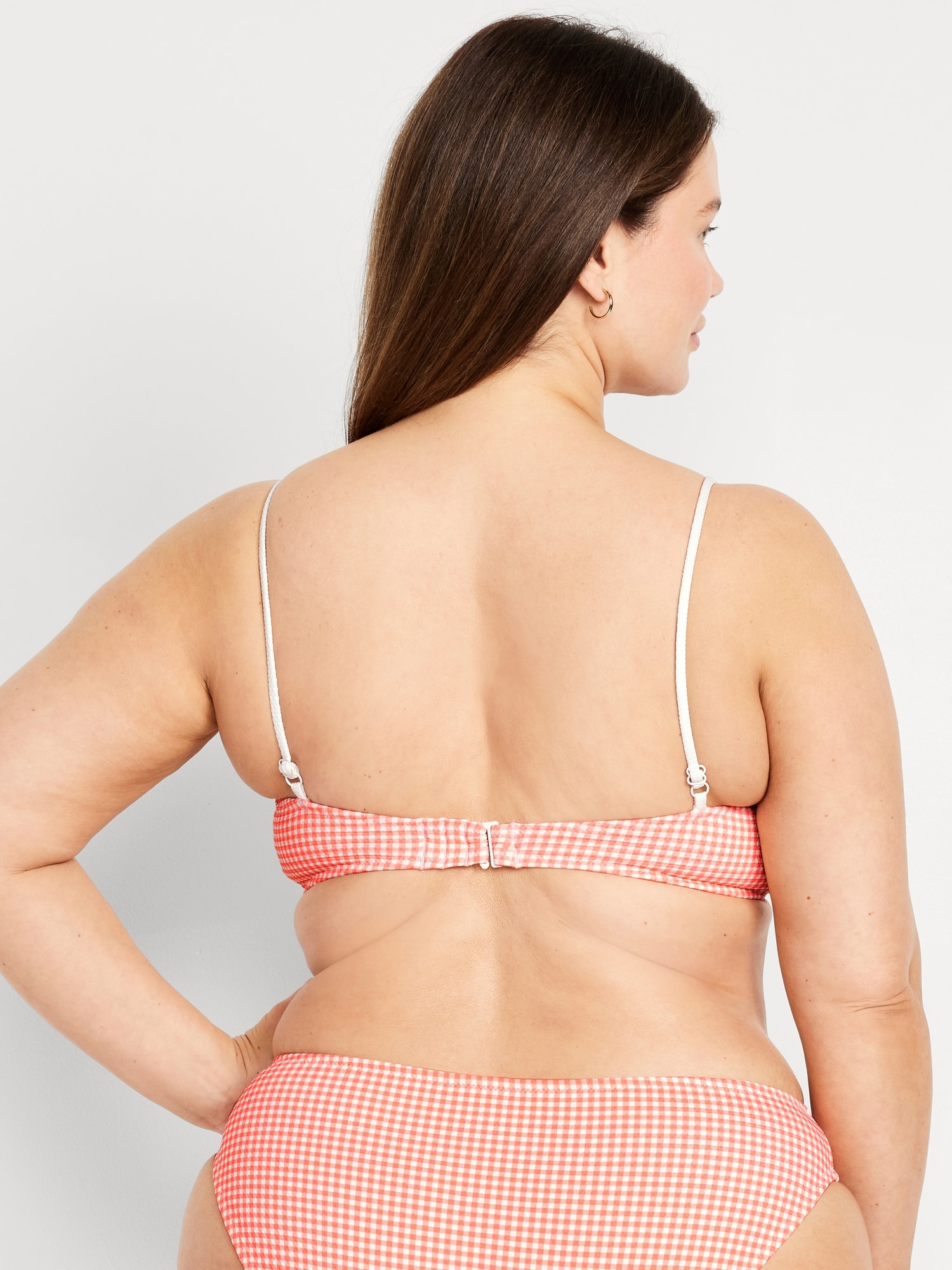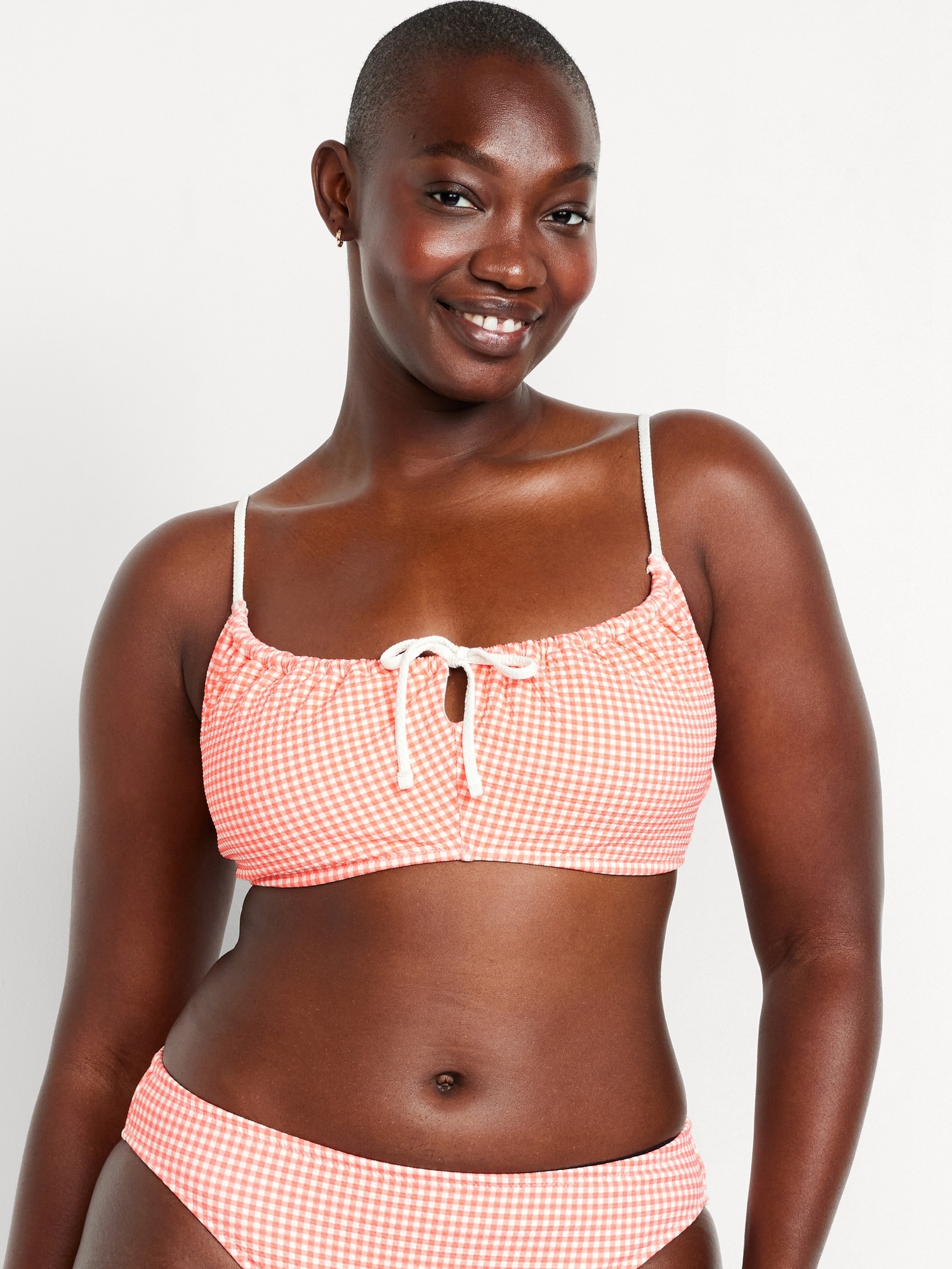Textured Gingham Bikini Swim Top: adjustable spaghetti straps, scoop neck, tie-front keyhole accent, ruched bodice, removable pads, back clasp, gingham print, #685285