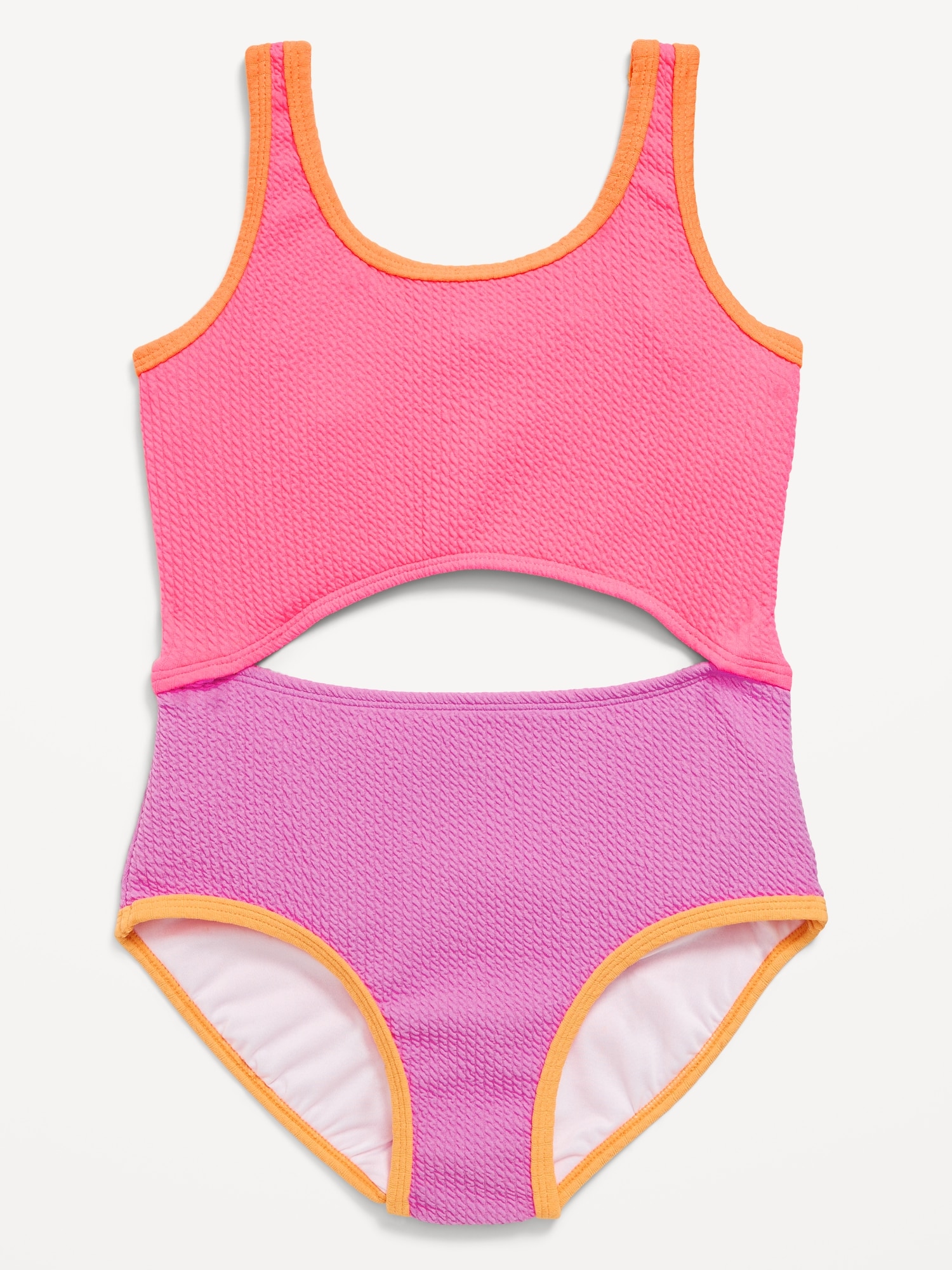 Textured Jacquard Cutout One-Piece Swimsuit for Girls: scoop neckline, wide straps, dome-shape cutout at front and back, #691891