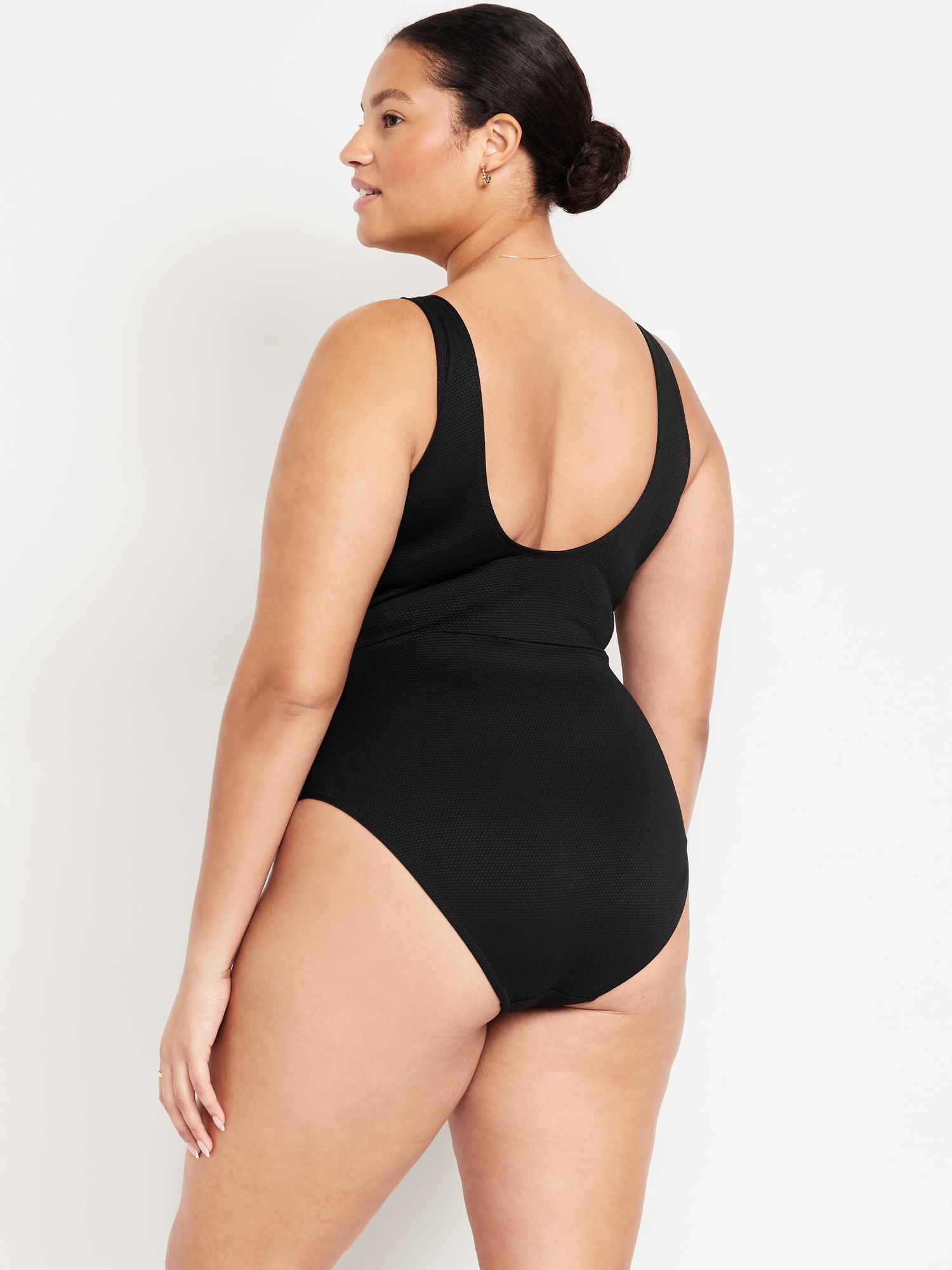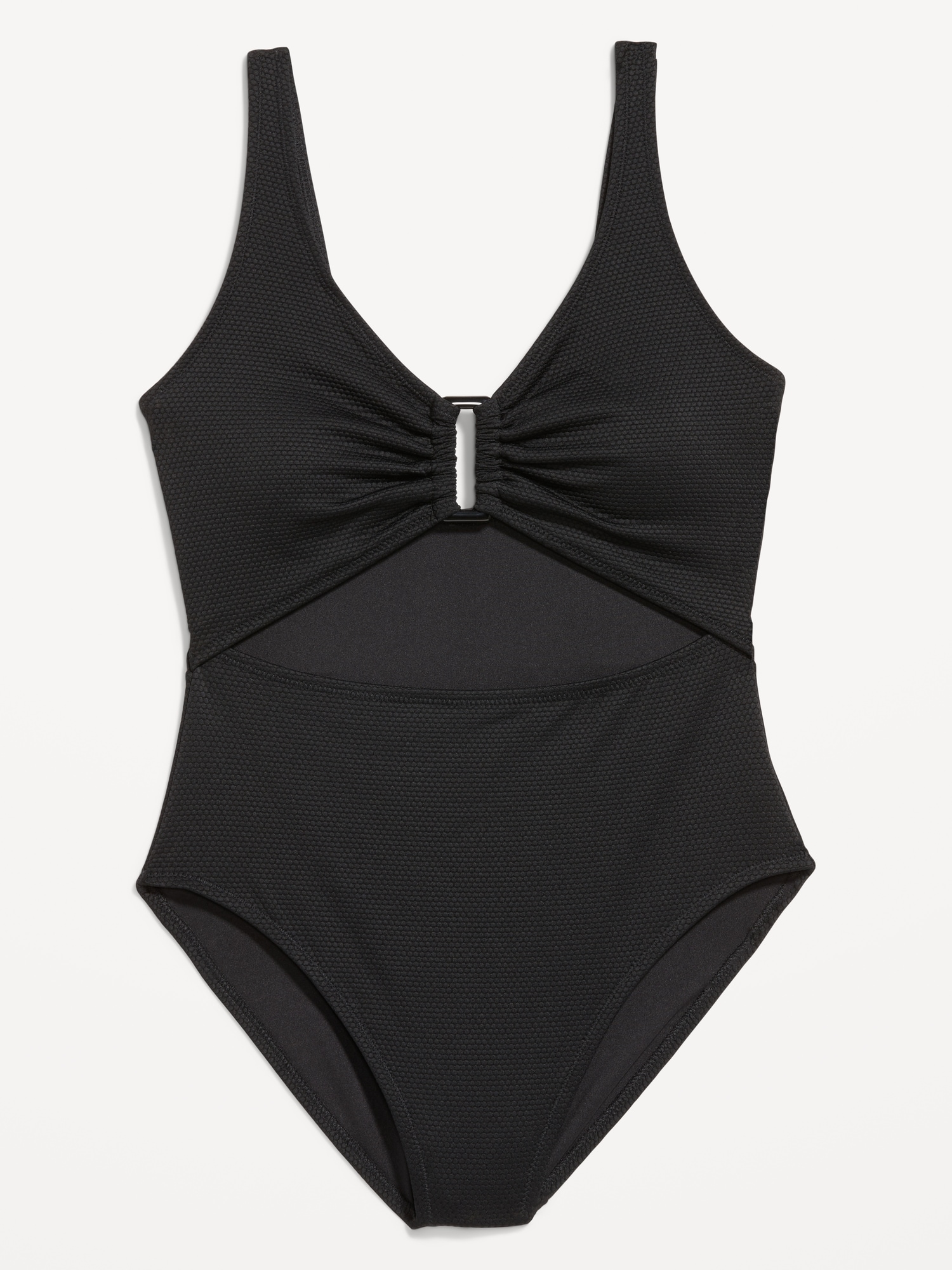 Textured One-Piece Cut-Out Swimsuit: v-neck, wide straps, scoop back, removable pads, cut-out front, elasticized leg openings, #660700