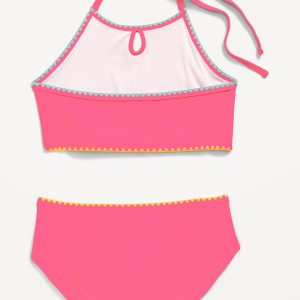 Textured Strappy Halter Bikini Swim Set for Girls: scoop neck, wide shoulder straps, tie-knot at hem, matching bikini swim bottoms, elasticized waist and leg openings, all-over print, #660307