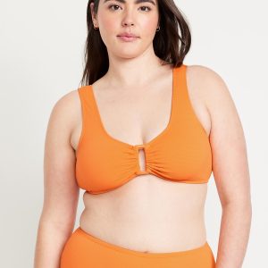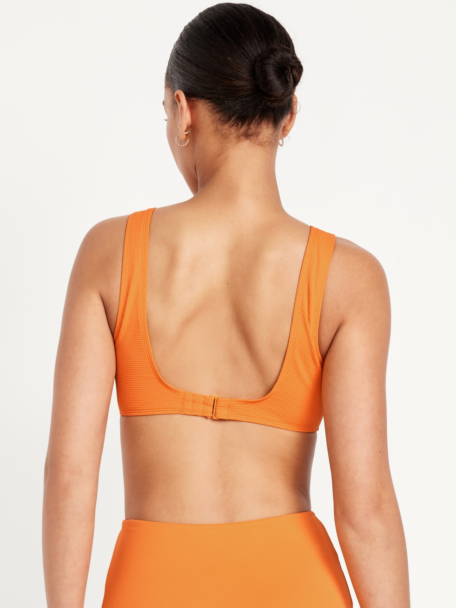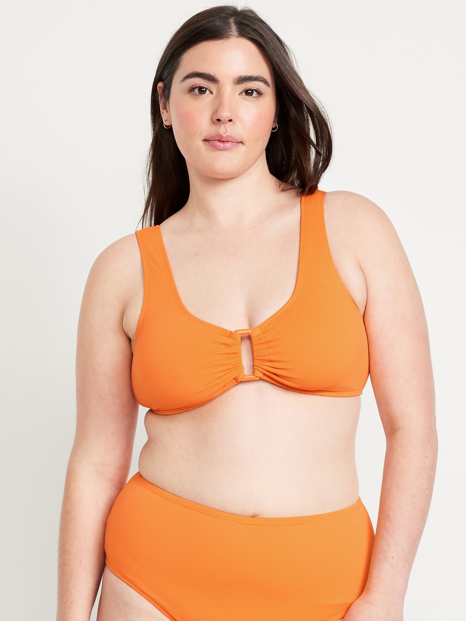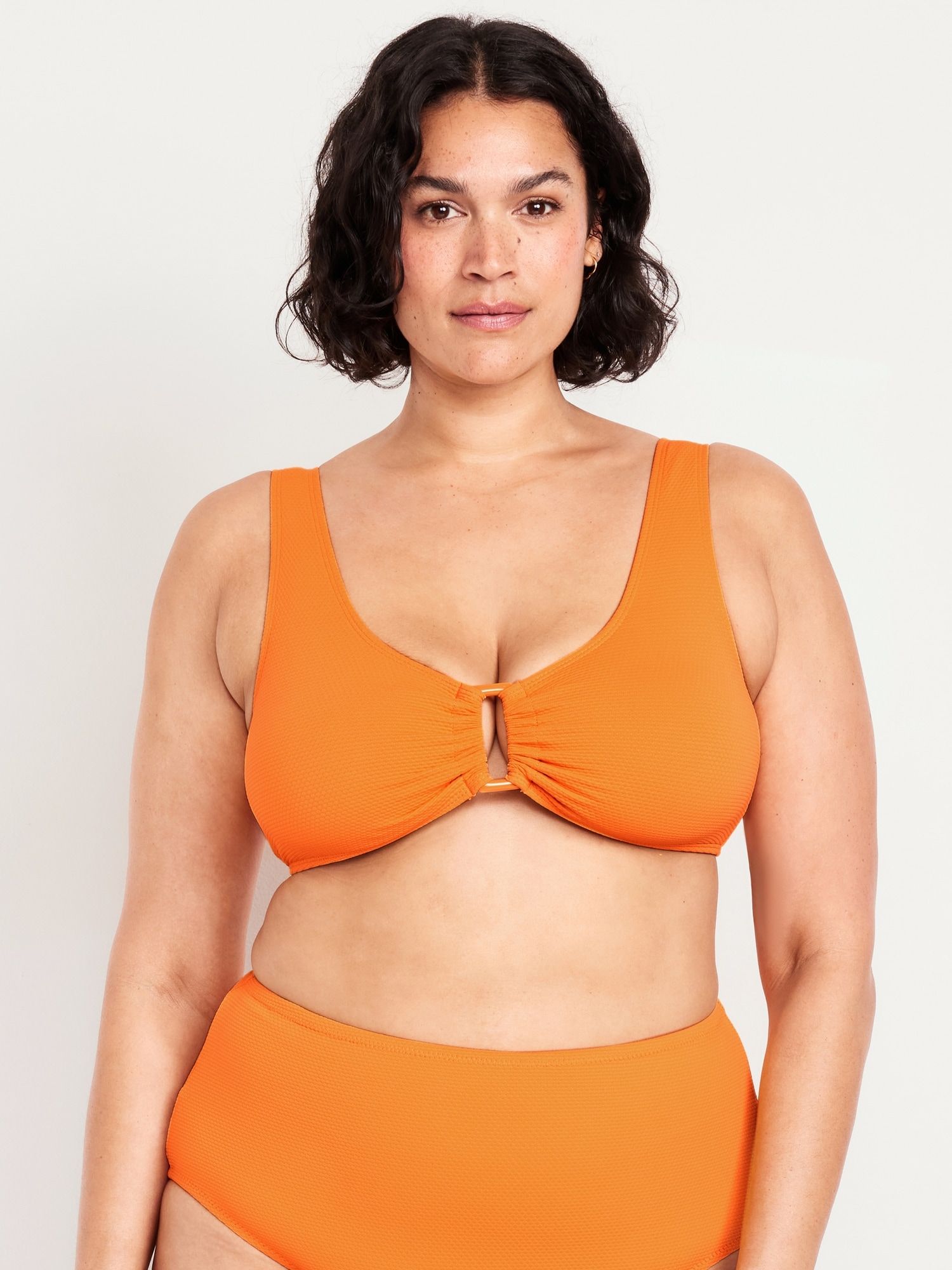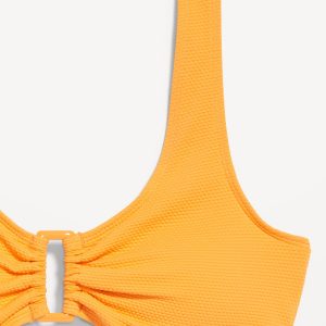 Textured Swim Top: scoop neck, wide straps, ruched front with o-ring accent, removable cups, hook-and-eye clasp at back, #660878