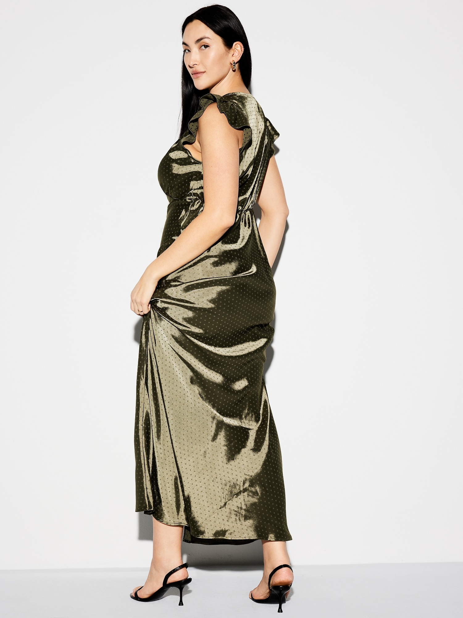 The Occasion by Old Navy Flutter-Sleeve Satin Maxi Dress: New! Special dresses and sets, made to make an entrance.deep v-neck, flutter-trim arm openings, seamed empire waist, center back elastic for comfort, front center slit, shirred detail, subtle tonal dots for a more dressed-up look, for parties, proms, graduations, weddings — these looks love an RSVP, #705416