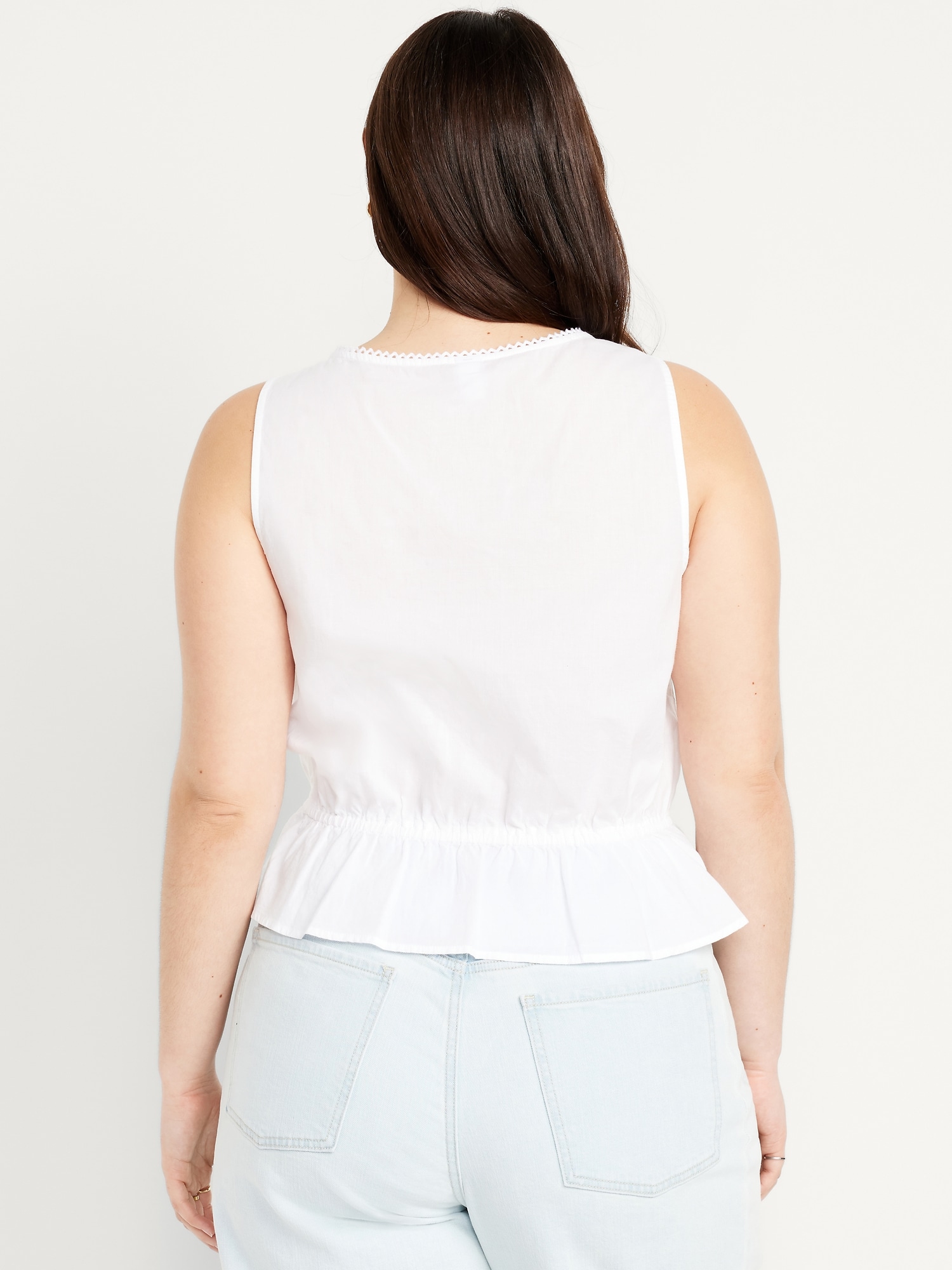 Tie-Waist Lace-Trim Top: picot lace-trim square neck, wide straps, five-button front, elastic tie-belt waist, #705128