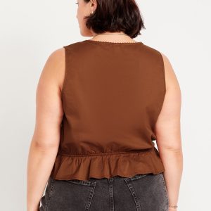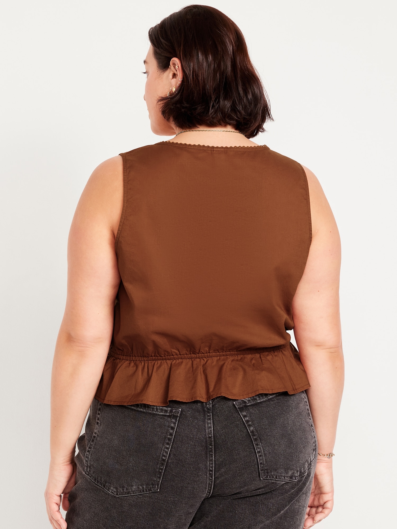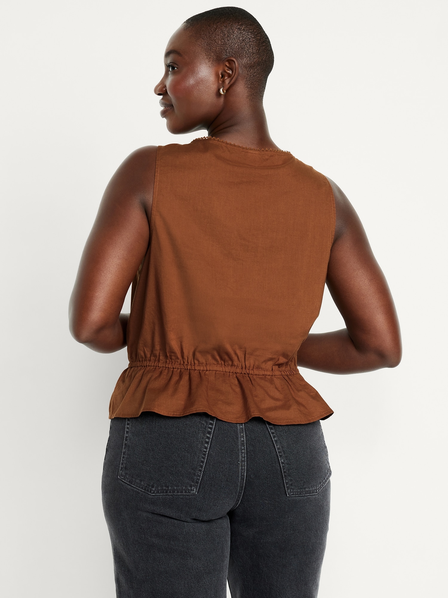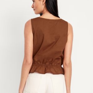 Tie-Waist Lace-Trim Top: picot lace-trim square neck, wide straps, five-button front, elastic tie-belt waist, #705128