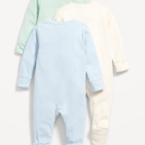 Unisex 3-Pack Sleep & Play 2-Way-Zip Footed One-Piece for Baby: Online exclusive!, Pack includes 3 footed sleep & play one-pieces for baby, each in a different color, print or pattern., These one-pieces are totally adorable & unisex, too. Wearable & shareable for him, for her, for them., Rib-knit crew neck, with zipper-guard tab at neck., Long sleeves., Fold-over mittens at each sleeve flip over to keep baby’s hands warm and protect tender skin from scratches. Genius!, Full-length one-way zipper down center front & along left inseam for easy dressing and diaper changing., Where’s the 2-way zipper? We know you love it (we love it too)! Unfortunately, supply chain snafus have made these hard to get. We hope to update this 1-way zipper to 2-way as soon as possible ??, Sewn-in feet., Soft-washed fine-gauge rib-knit cotton., #804367