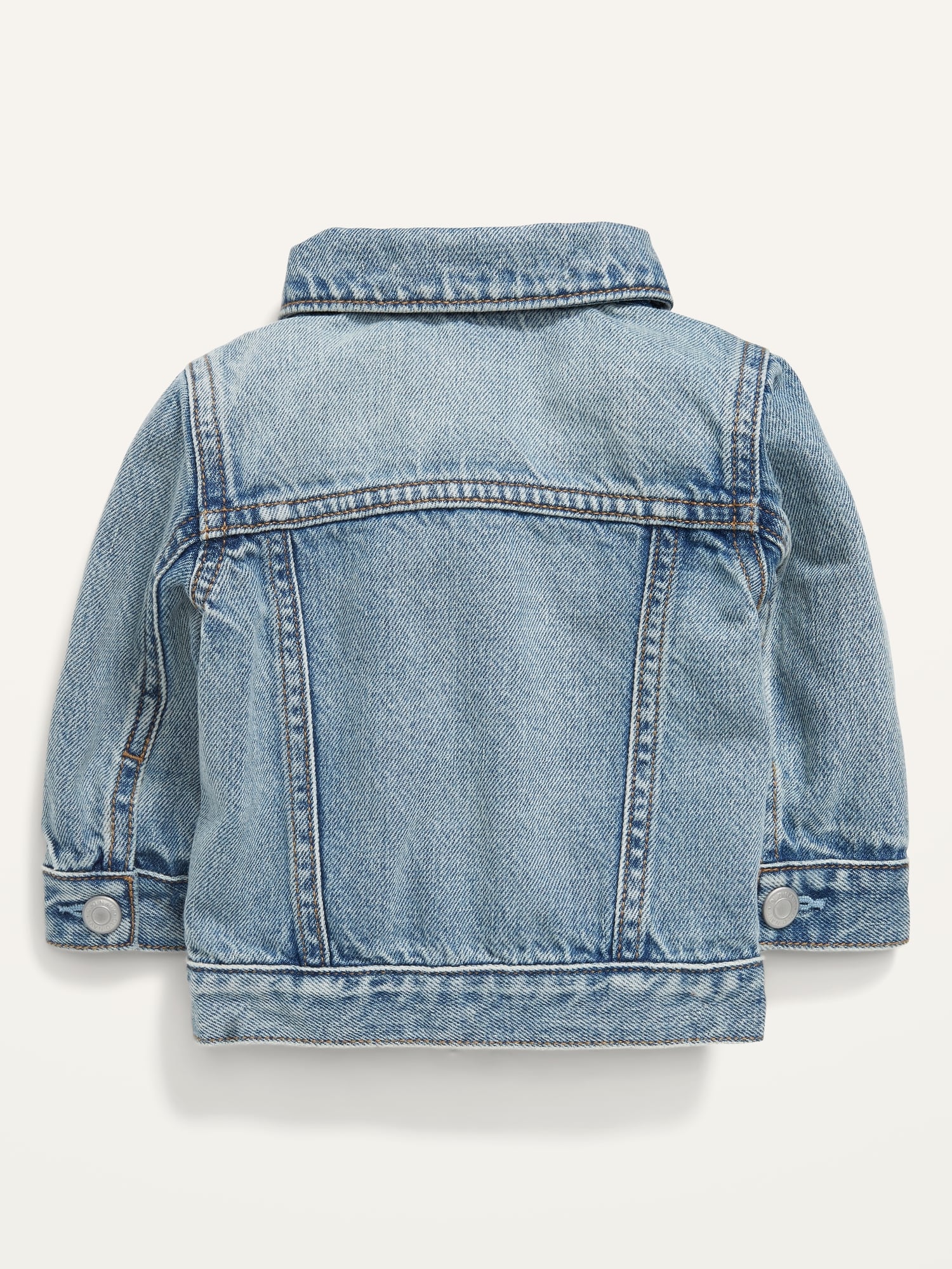 Unisex Light-Wash Jean Jacket for Baby: This jean jacket is totally adorable & unisex, too. Wearable & shareable for her, for him, for them., Spread collar., Seamed yoke at front and back., Long sleeves, with snap-button cuffs., Four snap-button front., Decorative snap-flap faux pockets at chest., Functional welt pockets at front., Banded hem., Soft, durable 100% cotton light wash denim., Bleaching and whiskering create a vintage look., This jean jacket is made with 5% recycled cotton. Less waste in the world??, #823354