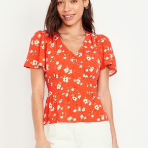 V-Neck Button-Down Crepe Top: v-neck, short flutter sleeves, button front, shirred shoulder seams, smocked back waist, #704153