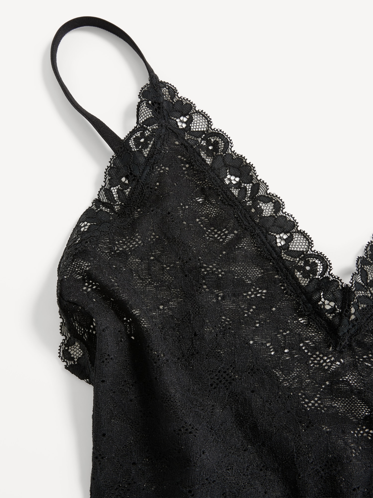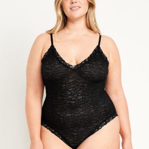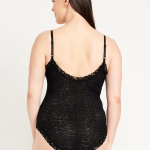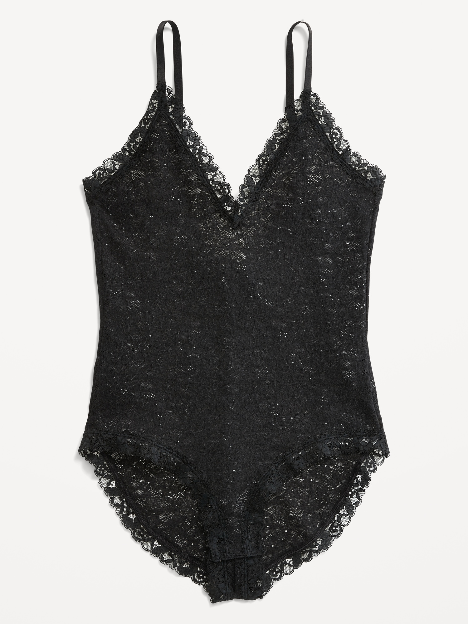 V-Neck Lace Bodysuit: deep v-neck, adjustable straps, scoop back, snaps at inseam, unlined, #487778