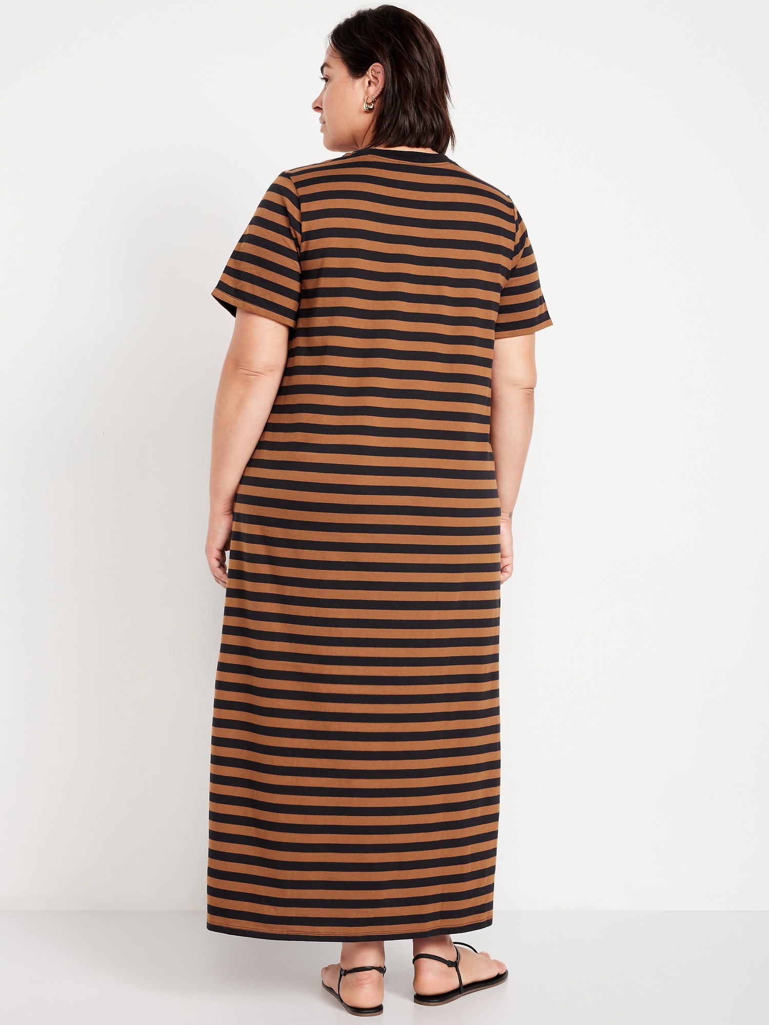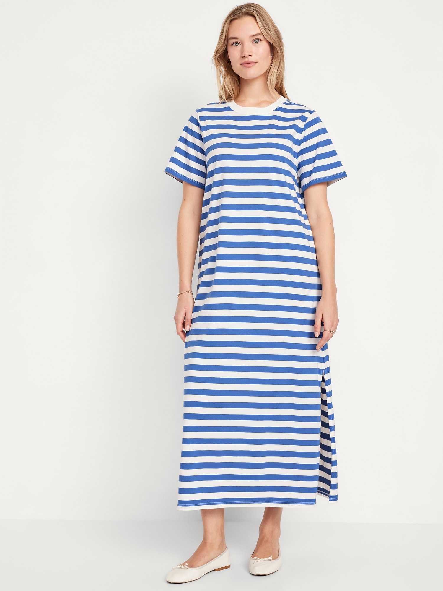 Vintage Crew-Neck Maxi T-Shirt Dress: A super relaxed fit with lived-in feels.rib-knit crew neck, short sleeves, side slits, striped print, #705306