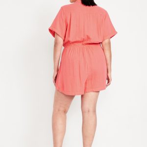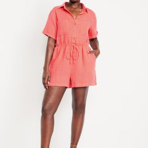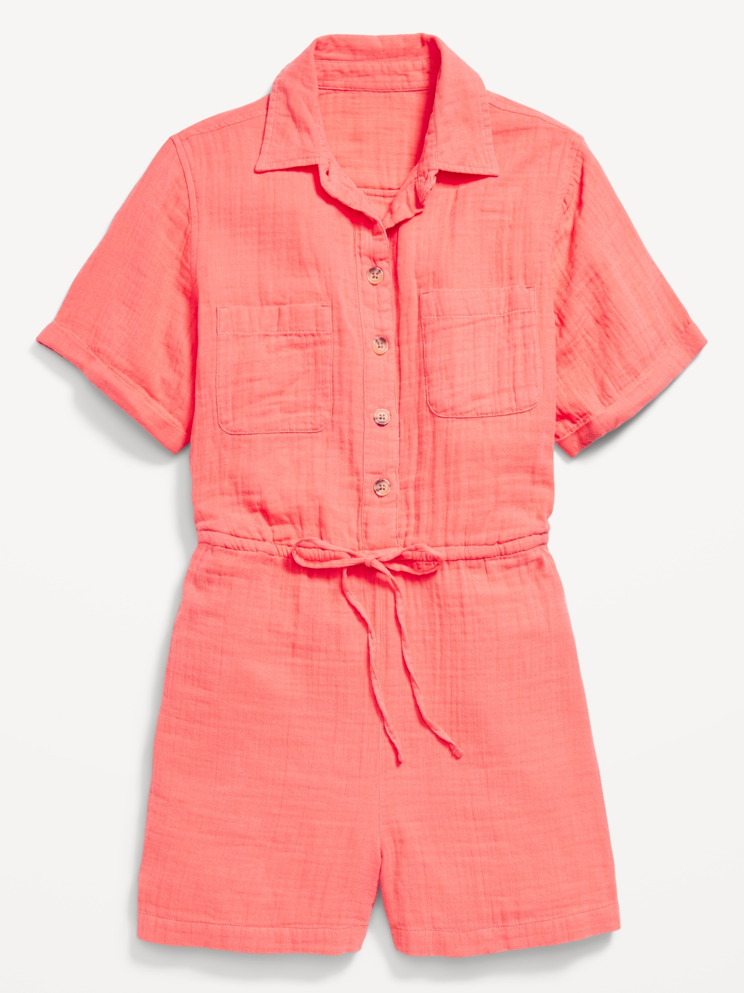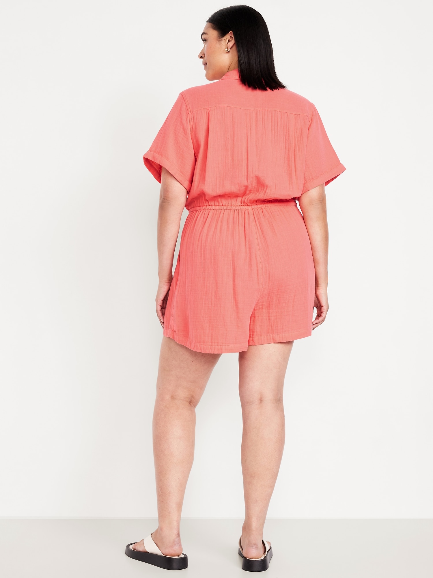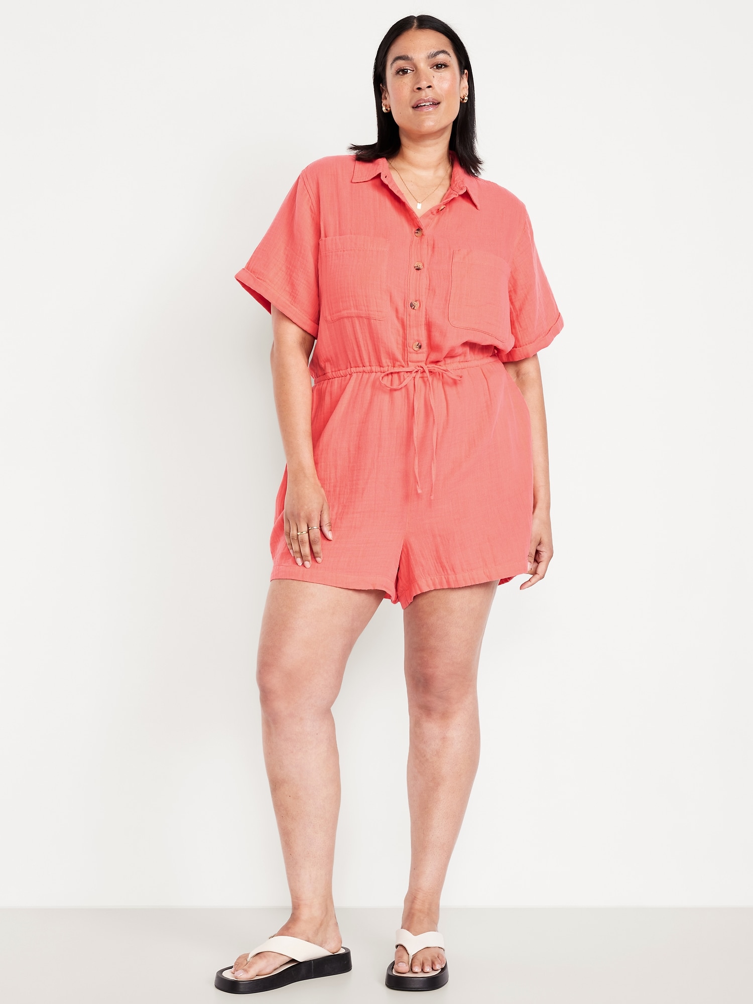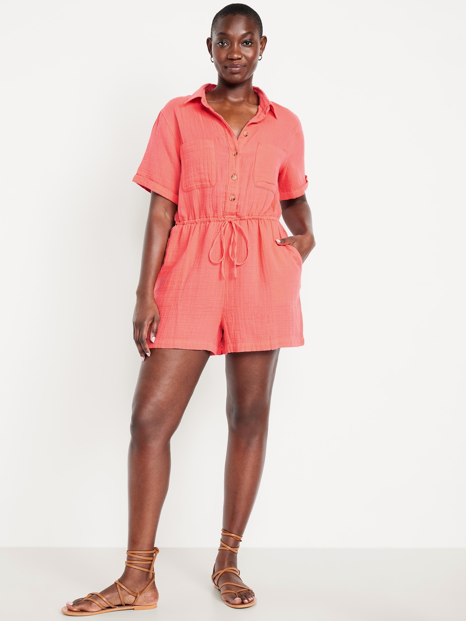 Waist-Defined Crinkle Gauze Romper: A light, rippled fabric that’s begging to be beachside.spread collar, short sleeves with rolled cuffs, button front, elastic waist with functional tie, patch chest pockets, diagonal front pockets, shirred detail, #705713
