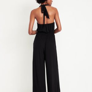 Waist-Defined Halter Jumpsuit: scoop neck, tie-back halter straps, shirred elastic waist, wide leg, #705487