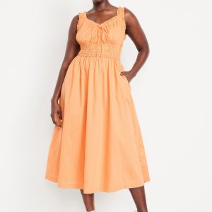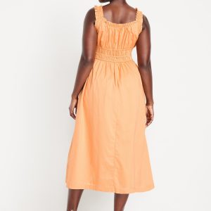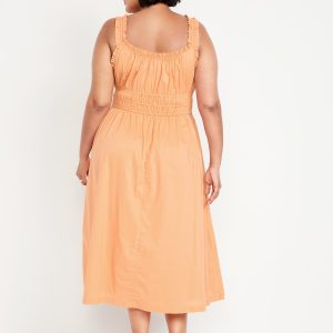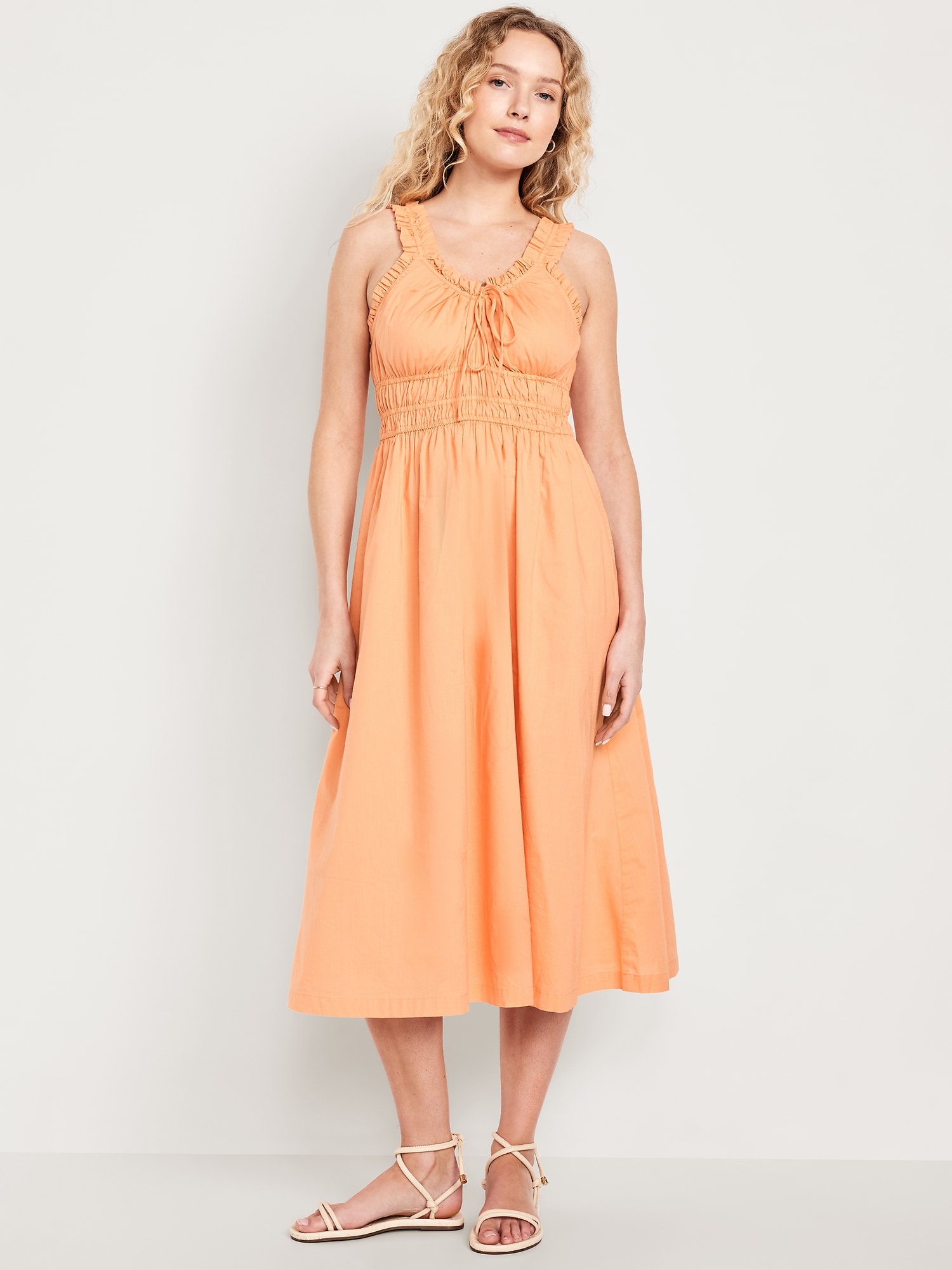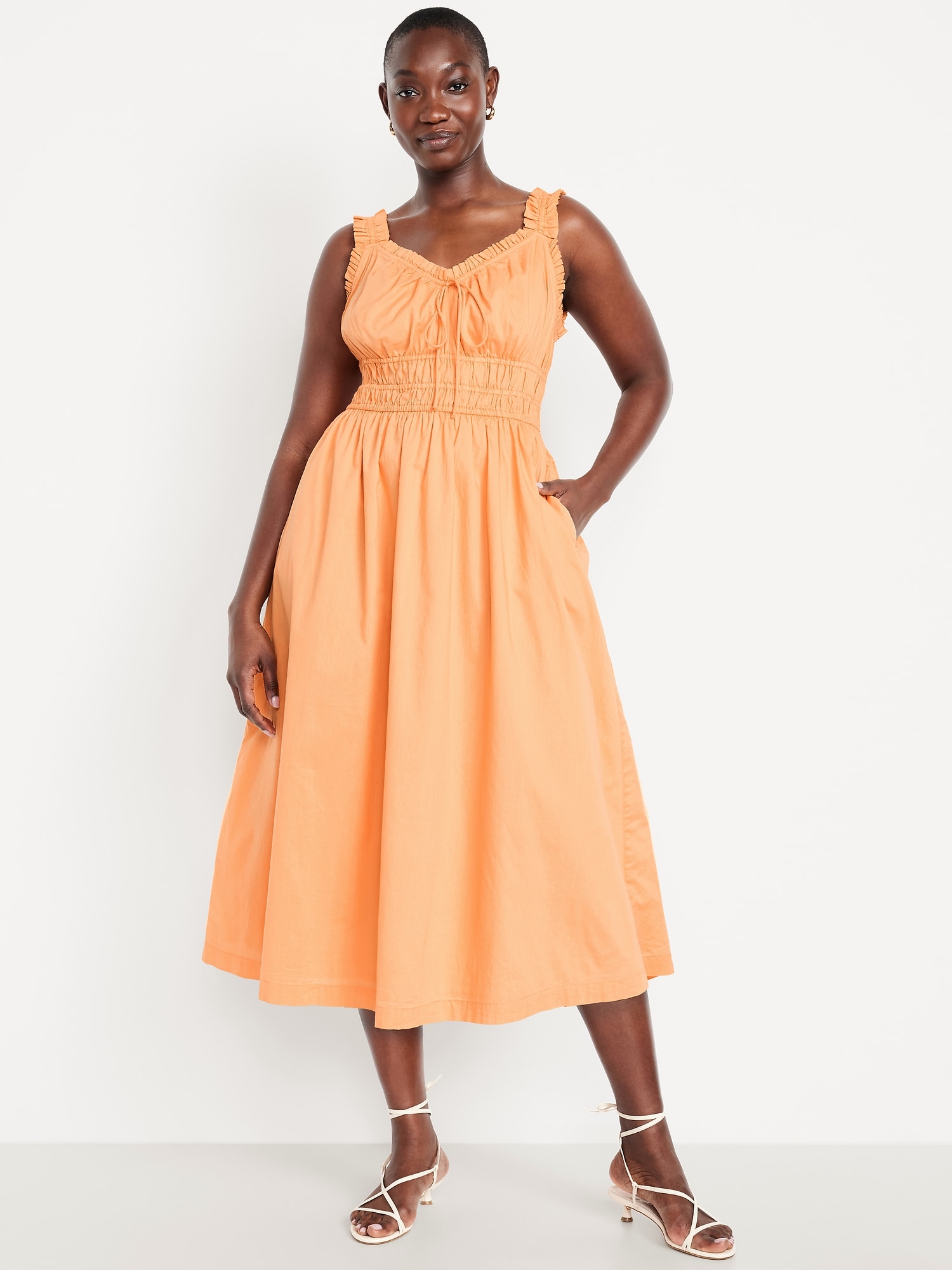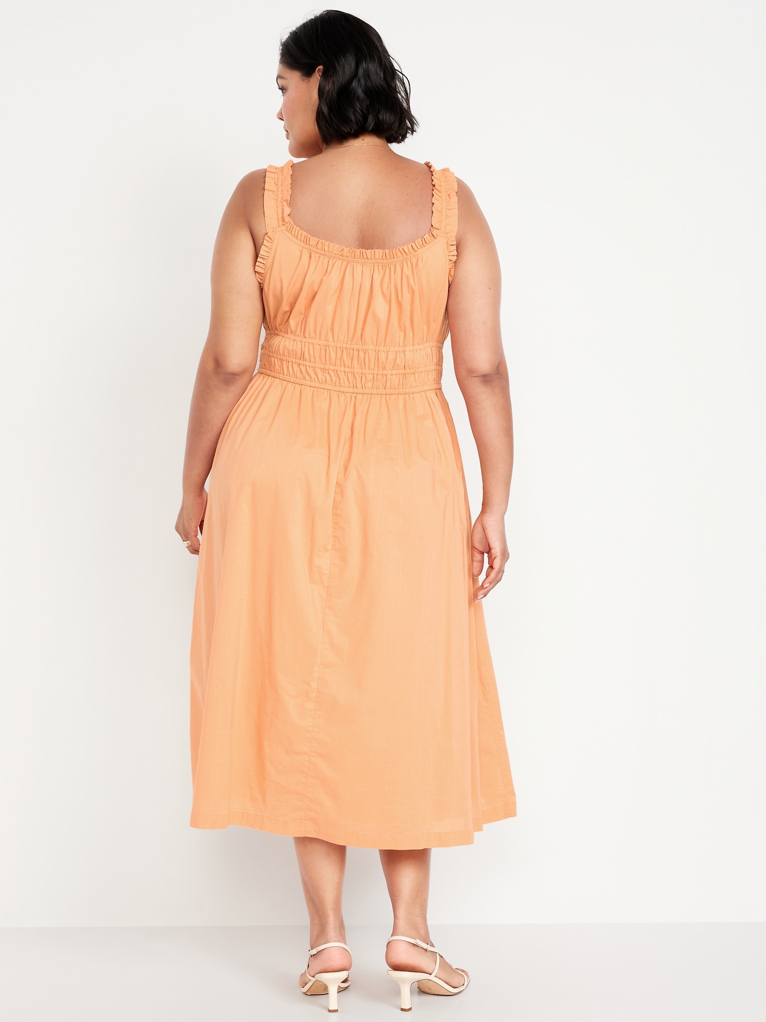 Waist-Defined Ruffled Midi Dress: v-neck, ruffled elastic straps, smocked waist, #705707