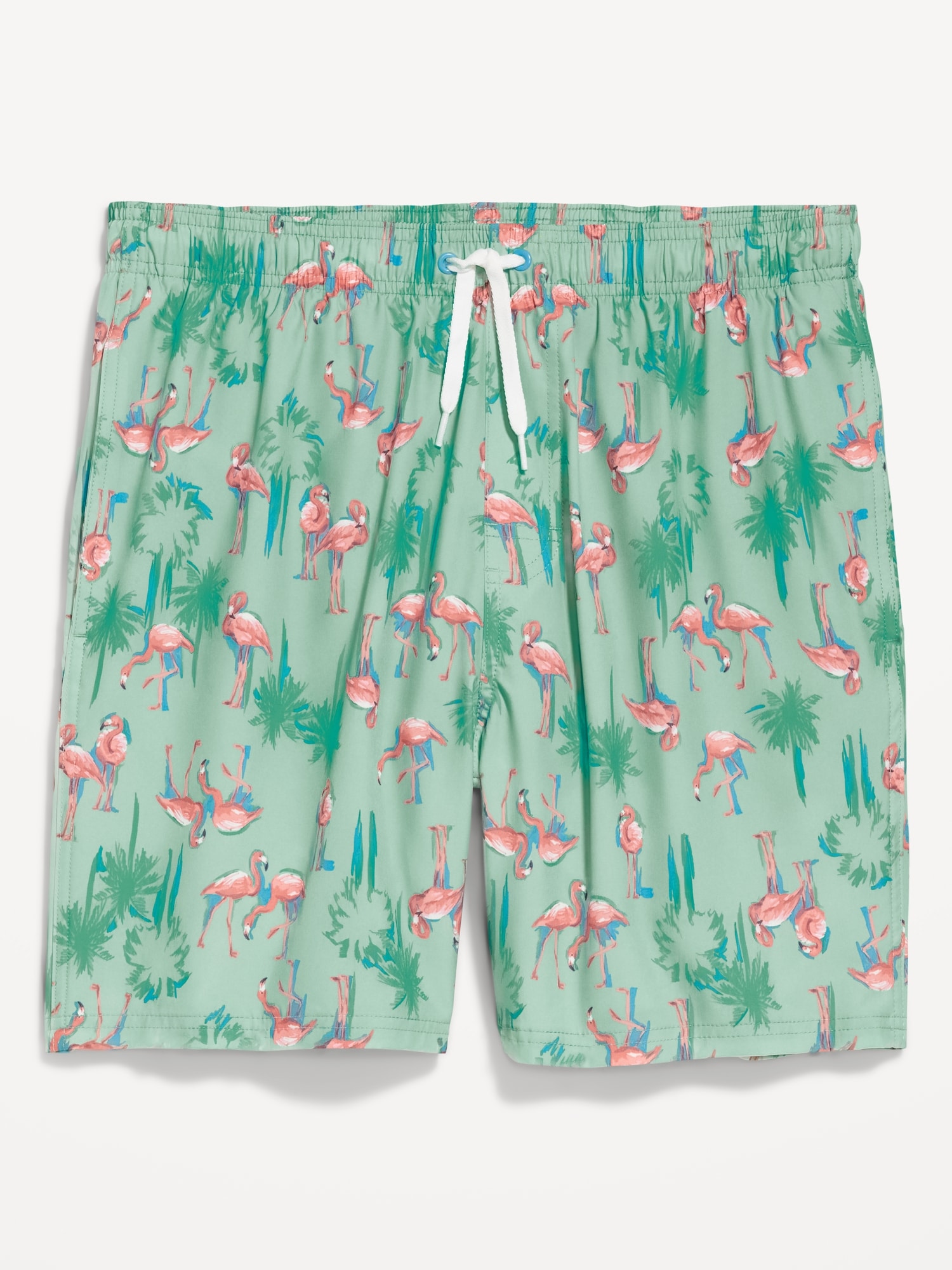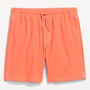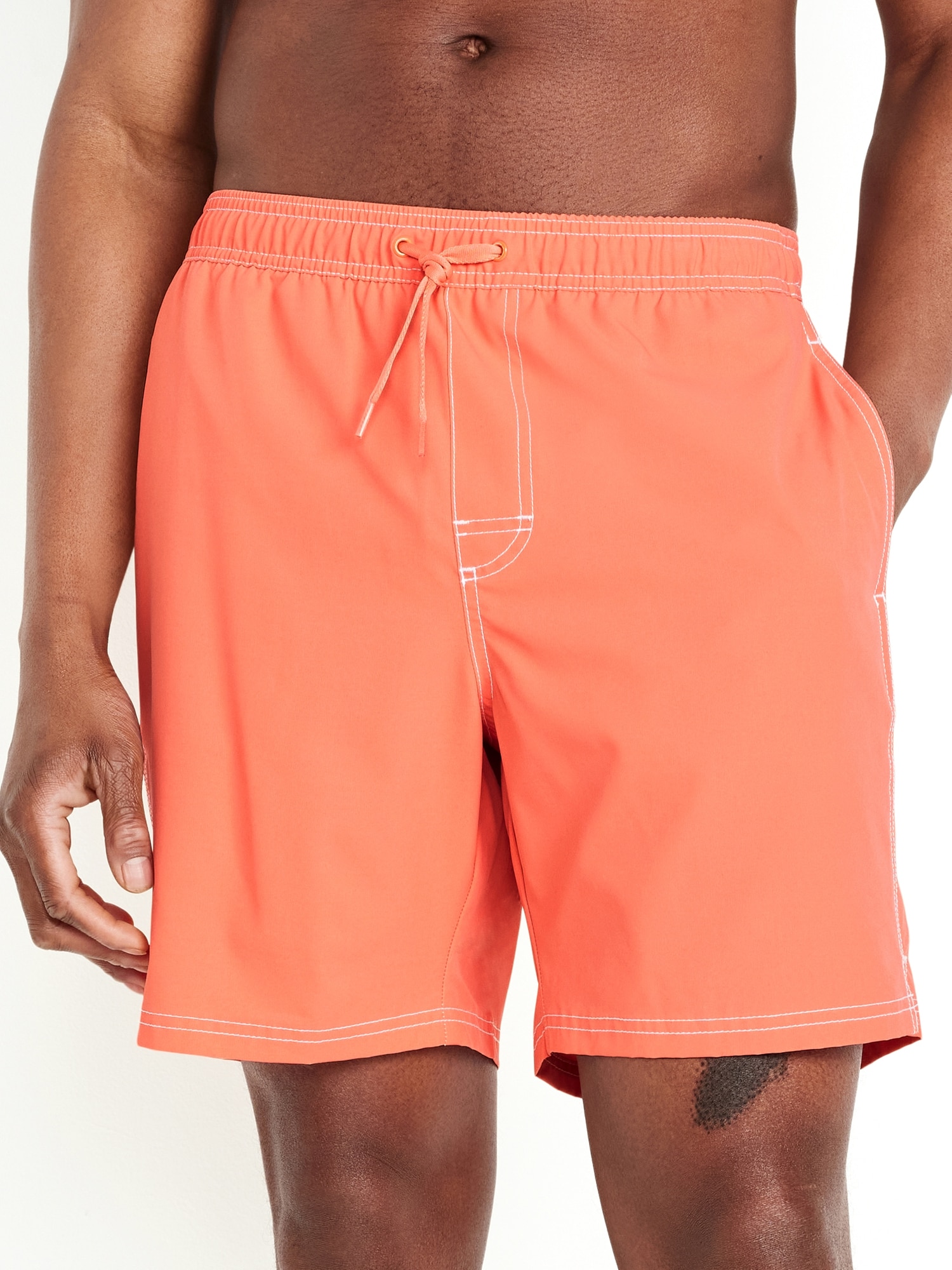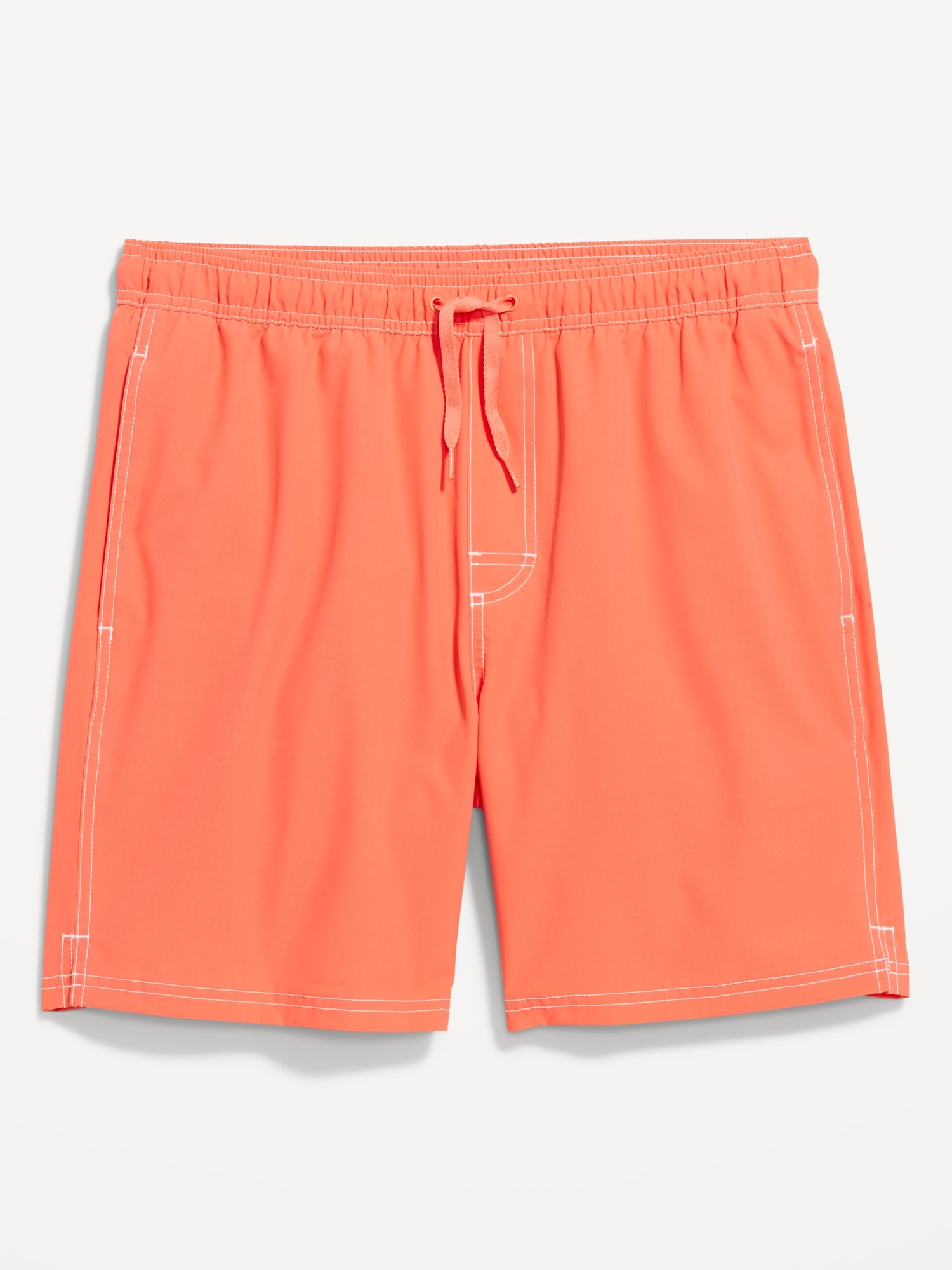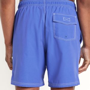 Washed Swim Trunks — 7-inch inseam: elastic-drawstring waistband, on-seam pockets, back patch pocket with grommet drain, built-in mesh briefs, pull-on style, #766290
