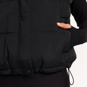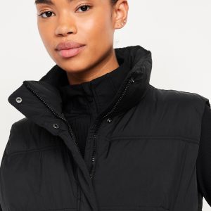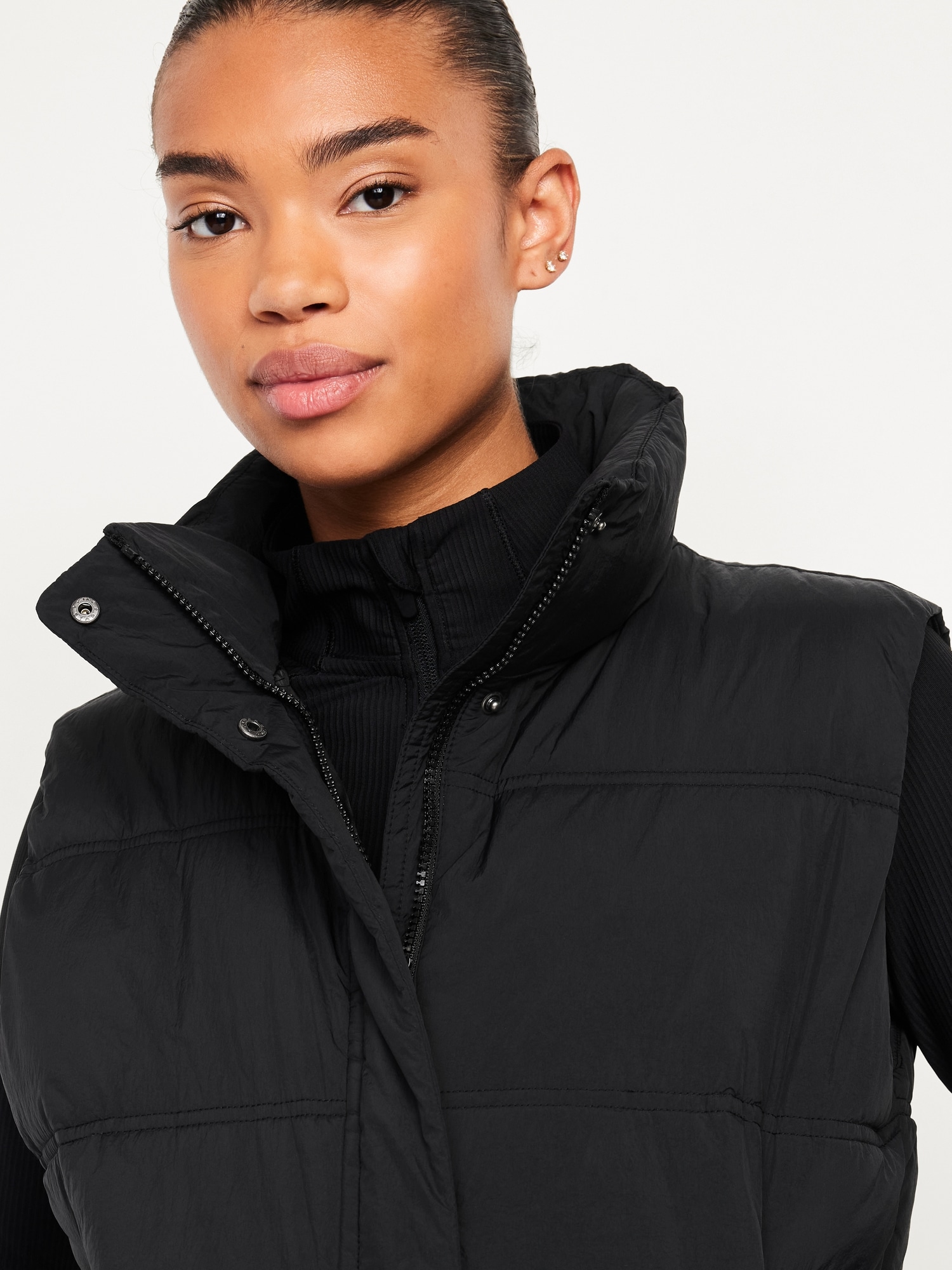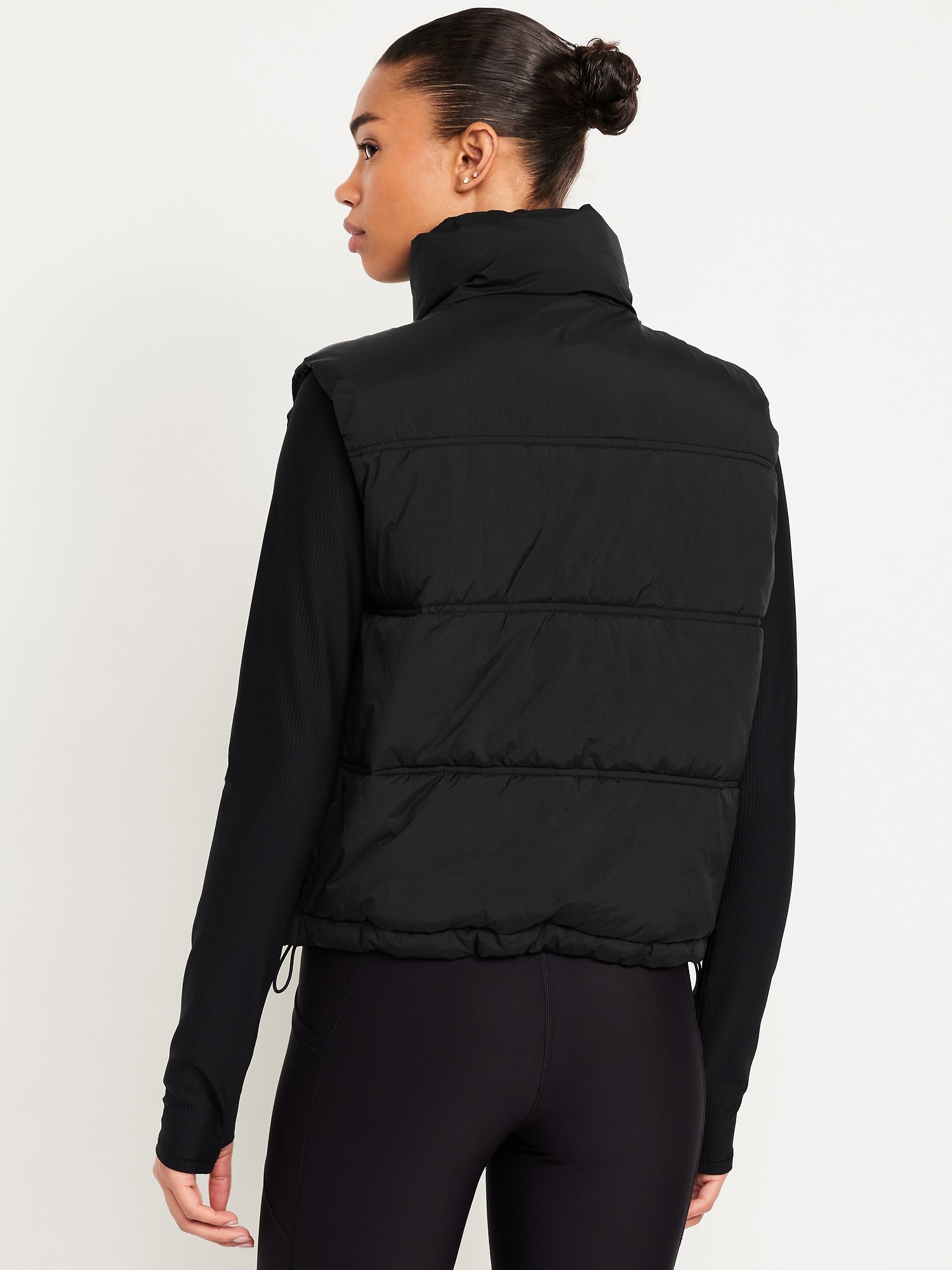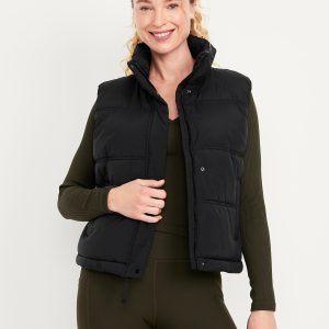 Water-Resistant Puffer Vest: mock neck, snap front with covered zipper, vertical welt pockets, adjustable bungee-cord waist, fully lined, #784467