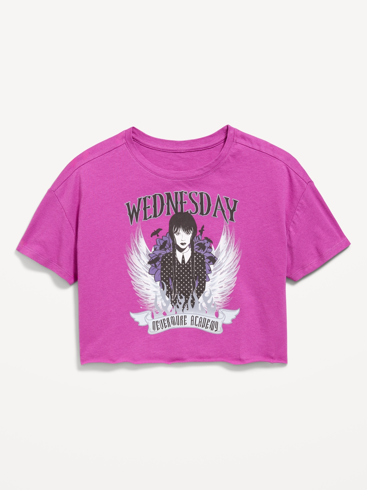 Wednesday™ Oversized Cropped Graphic T-Shirt for Girls: crew neck, short sleeves, licensed graphic, ™ & © 2025 Netflix Inc., on wednesdays, she wears purple (duh)., #763491