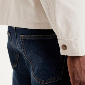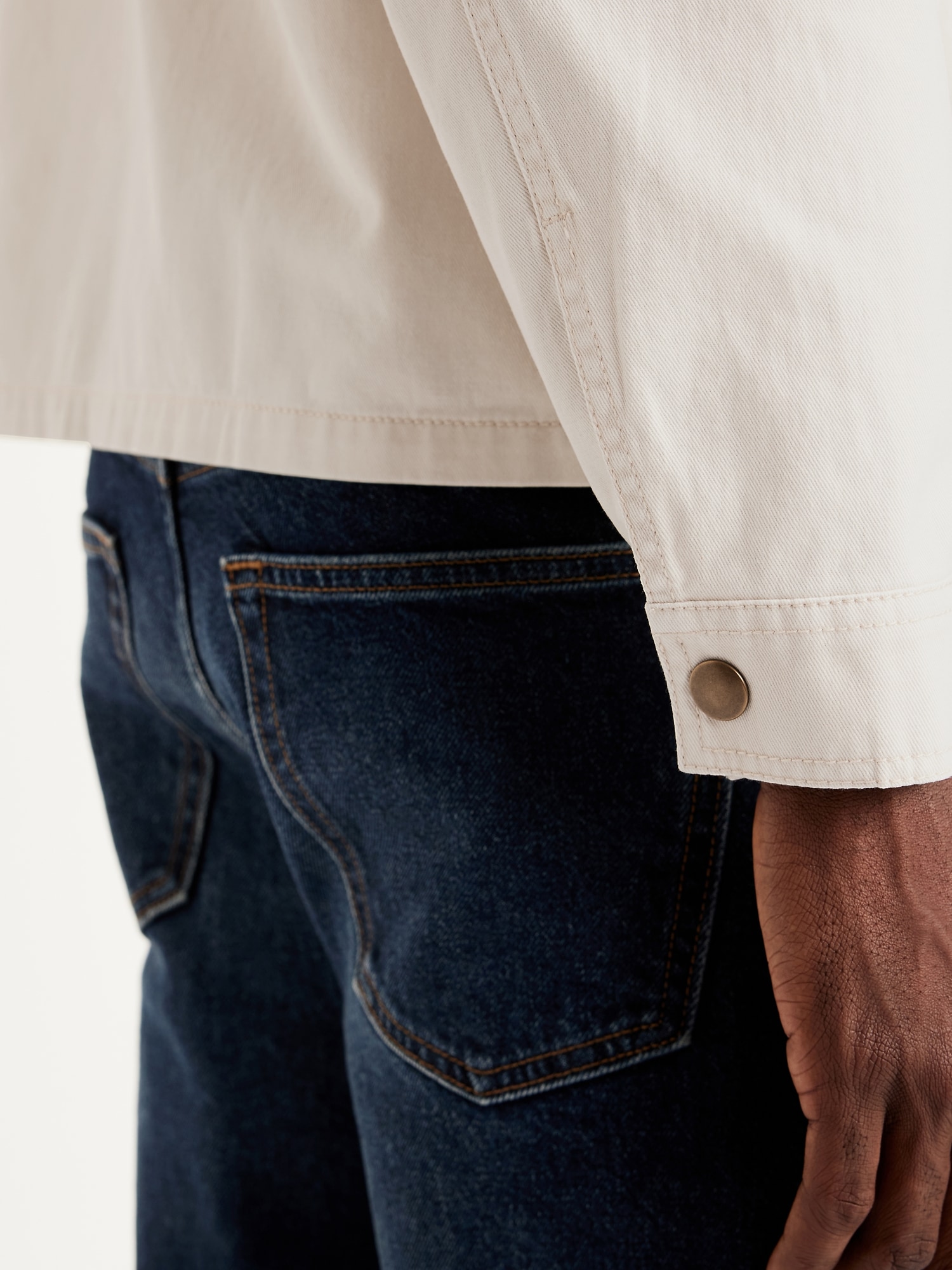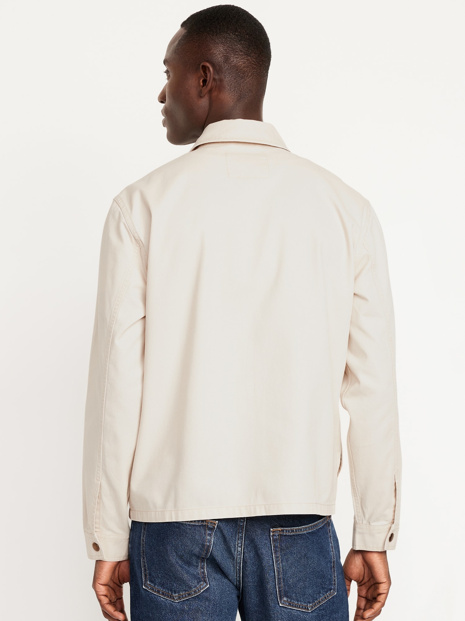 Workwear Zip Shacket: spread collar, long sleeves, workwear patch chest pockets, covered zip front, on-seam side pockets, hanging loop, #686492