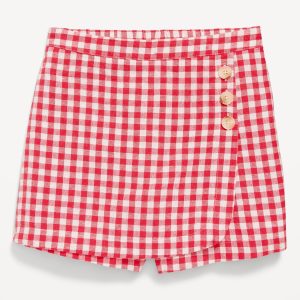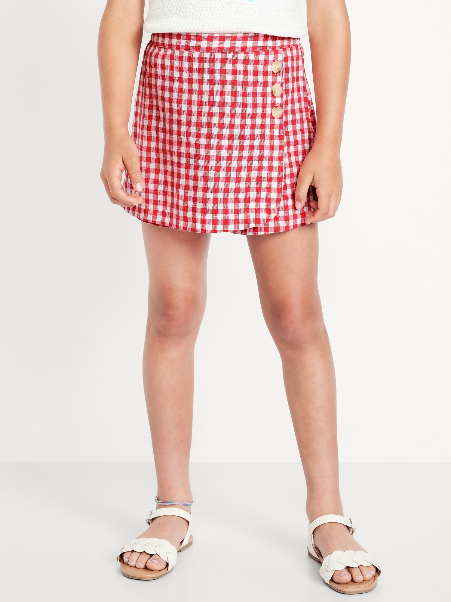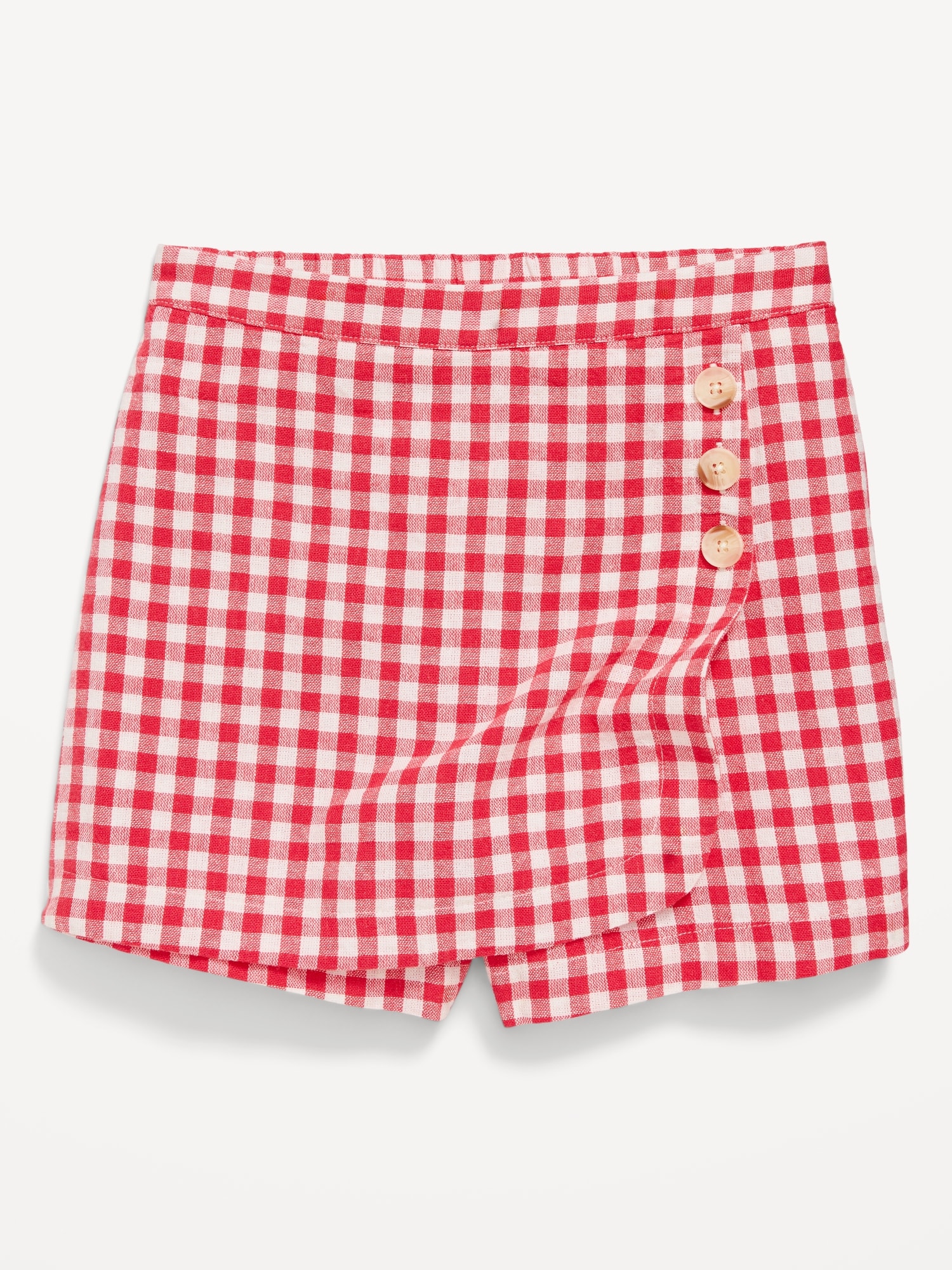 Wrap-Front Linen-Blend Skort for Girls: built-in shorts, elasticized back waist, decorative three-button front, easy pull-on style, #766700